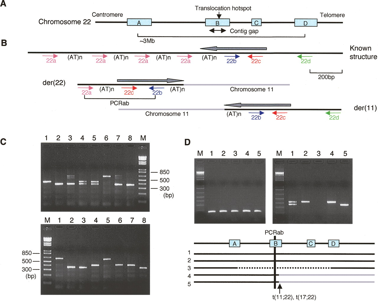 Development of a PCR system specific for the PATRR22 region. (A) LCR22 in 22q11.2. There are at least four copies of LCR22, LCR22A, LCR22B, LCR22C, and LCR22D. One of the LCR22s, LCR22B, is the site of a genomic contig gap as well as the translocation breakpoint hotspot. (B) Location and orientation of the four PCR primers on the known structure appearing in other LCR22s and the t(11;22) translocation derivative chromosomes. There are multiple copies of primer “a” as a result of tandem repeats. Black lines indicate chromosome 22, while light-gray lines indicate chromosome 11. All of the genomic clones present in the database manifest the “known structure.” Only a der(22)-containing clone should be positive for the PCRab products. “(AT)n”s indicate the AT-rich region. Gray arrows indicate the putative PATRR22 arms. (C) Representative results of the PCRab reaction on genomic DNA. (Top) PCRab for eight normal individuals; (bottom) PCRab for patients with the 22q11.2 deletion syndrome. The additional bands originating from heteroduplexes appear as PCR artifacts in lanes 3 and 7. (D) The PCRbc (left) and PCRab (right) for somatic cell hybrids. The positive PCRbc product arises as a result of the presence of any of the LCR22s in the hybrids, while the positive PCRab product is derived only from LCR22B. (Lane 1) Normal human; (lane 2) GM10888, a human/hamster hybrid containing a normal chromosome 22 as its only intact human chromosome; (lane 3) Cl6-2/EG, a human/hamster hybrid containing a del(22q11.2) chromosome; (lane 4) Cl-4/GB, a human/hamster hybrid cell line containing the der(22) of a constitutional t(11;22); (lane 5) GM11685 (NF13/D3), a subclone of a human/mouse hybrid cell line containing the der(22) of a constitutional t(17;22). Black solid lines in the diagram below represent the chromosome 22q11 regions present in the hybrid lines analyzed.
