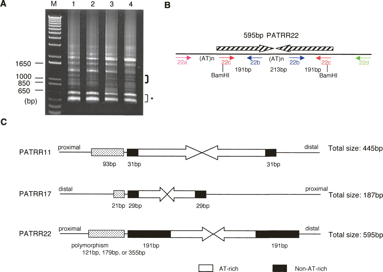 Molecular cloning and characterization of the PATRR22. (A) PCRad for four individuals. PCR products appearing as prominent bands did not contain the PATRR22. The DNA fraction indicated by the thick bracket contains the authentic PATRR22. Bands indicated by a thin bracket with an asterisk are derived from LCR22s with the standard structure. (B) Structure of the PATRR22. Hatched arrows indicate each unit of inverted repeats. Small arrows depict PCR primers. (C) Characteristics of the three translocation-related PATRRs. Arrows indicate each unit of inverted repeats of the PATRR. Black boxes indicate relatively non-AT-rich regions, while stippled boxes indicate the AT-rich regions flanking the PATRRs.