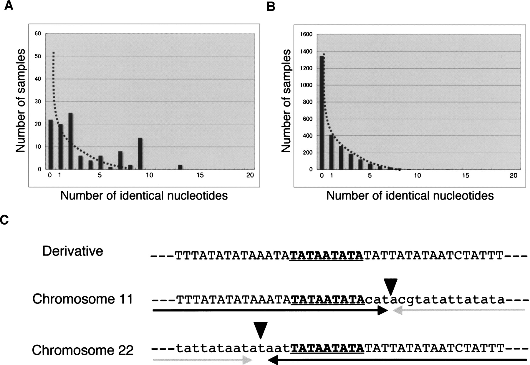Analysis of microhomologies at the breakpoints. (A) The number of identical nucleotides at the breakpoints of the t(11;22). The dotted line indicates the putative sample numbers from simulation of NHEJ. (B) A random simulation of the translocation. The details of the procedure are given in the Methods. The scale of the vertical axis is adjusted to reflect sample number relative to that shown in the graph (A). (C) Detail of one junction showing nine identical nucleotides (Case 3). The top indicates the junction fragment, while the middle and bottom indicate original breakpoint sequences. The arrows indicate each unit of the inverted repeats, while the arrowheads indicate the center of the PATRR.