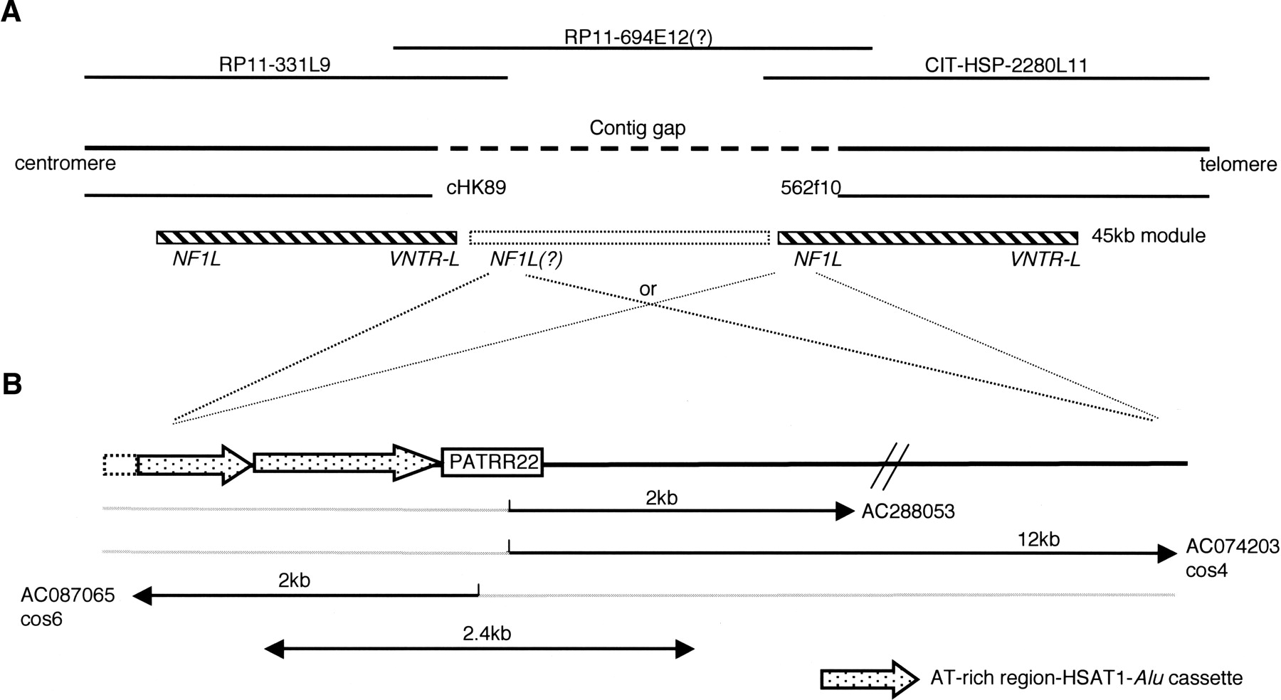 Structure of the region surrounding the PATRR22. (A) Predicted structure of LCR22B. There is still a contig gap in LCR22B; the end of the proximal contig is the telomeric end of cHK89, whereas the end of the more distal contig is the centromeric end of BAC RP11-562f10. Ensembl indicates BAC RP11-694E12 as a bridging clone possibly using partial sequence data. Two 45-kb modules, major components of LCR22, are indicated by hatched boxes. Both 45-kb modules contain segments previously designated “NF1L” and “VNTR-L” in the same orientation (Shaikh et al. 2000). Another 45-kb module could potentially reside in the middle. (B) The region surrounding PATRR22. AC288053 and AC074203 are derived from the der(11), whereas AC087065 is derived from the der(22). The bidirectional arrow indicates the longest PCR product identified in this study. Thick dotted arrows indicate the AT-rich region-HSAT1-Alu cassette.