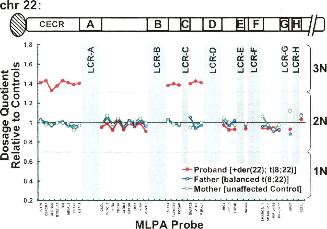 Mapping inversion and translocation breakpoints by MLPA. The relative dosage of 33 loci along 22q11 were assessed in genomic DNA samples derived from the proband (47,XX,+der(22) (q24.1;q11.2)pat) (red circles), her father (balanced t(8;22) carrier) (blue circles), and her unaffected mother (green circles) by MLPA. Dosage at each target locus is expressed as a dosage quotient relative to controls (data not shown). Dashed lines corresponding to established threshold values (Bunyan et al. 2004) are drawn such that dosage quotients between 0.3 and 0.7 are considered disomic (2N), below 0.7 haploid (1N), above 1.3 trisomic (3N). MLPA probes corresponding to 22q11 loci are listed on the X axis in relative order. The location and relative size of LCRs are indicated by gray shading. (CECR) Cat eye syndrome minimal chromosomal region.