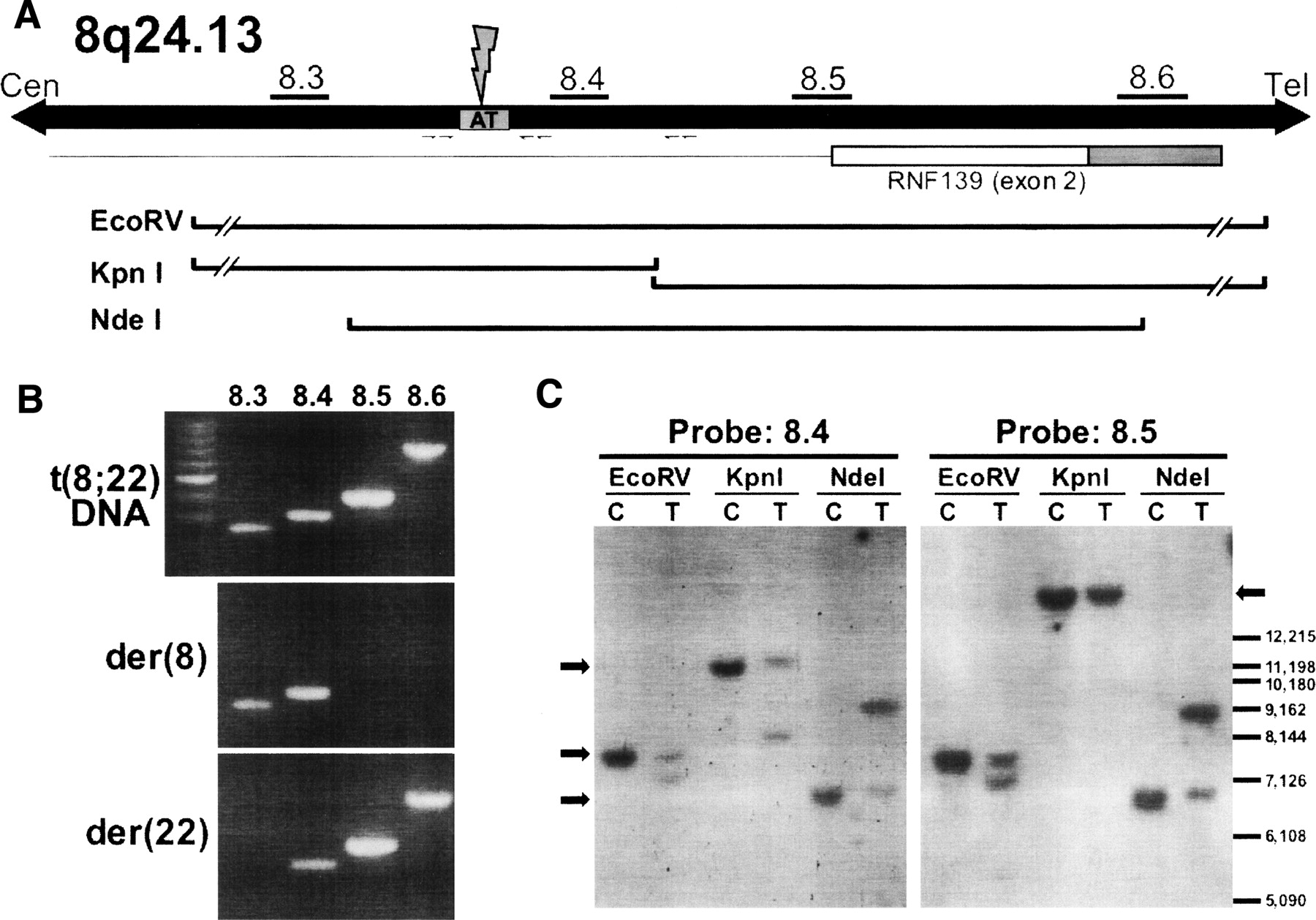 The 8q24.1 breakpoint localizes to a 3304-bp region within the first intron of the RNF139 gene. (A) Schematic representation of the 8q24.13 region showing the positions of the 8.3, 8.4, 8.5, and 8.6 amplicons used in mapping experiments relative to an AT-rich repeat present between the 8.3 and 8.4 primer pairs. Relative positions of restriction fragments analyzed in Southern blot experiments are also shown. The breakpoint identified by nested PCR experiments is also indicated. (B) PCR-mediated mapping of 8q24.1 sequences was performed on total genomic DNA relative to DNA template from LMPC-dissected der(8) and der(22) chromosomes. Results from the 8.3, 8.4, 8.5, and 8.6 amplicons are shown. (C) Southern blot analysis of genomic DNA from normal control sample (“C”) and the t(8;22) carrier (“T”) digested with EcoRV, KpnI, and NdeI restriction enzymes. Amplicons 8.4 and 8.5 were radiolabeled and used as probes. Arrows indicate the position of expected restriction fragments.