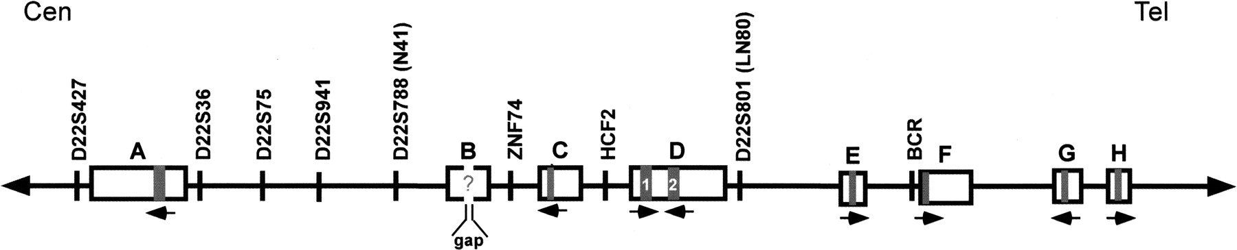 BCRL modules within the 22q11 LCRs. The region of 22q11 containing LCR-A–LCR-H is shown. The LCRs are labeled and shown as white boxes. The BCRL modules within each LCR are shown as gray boxes. The gap within the sequence of LCR-B is indicated. The “?” denotes the unknown status of the presence or absence of a BCRL module within LCR-B. The two copies of BCRL in LCR-D are denoted as “1” and “2.” The relative orientation of the BCRL modules with respect to each other is indicated with directional arrows.