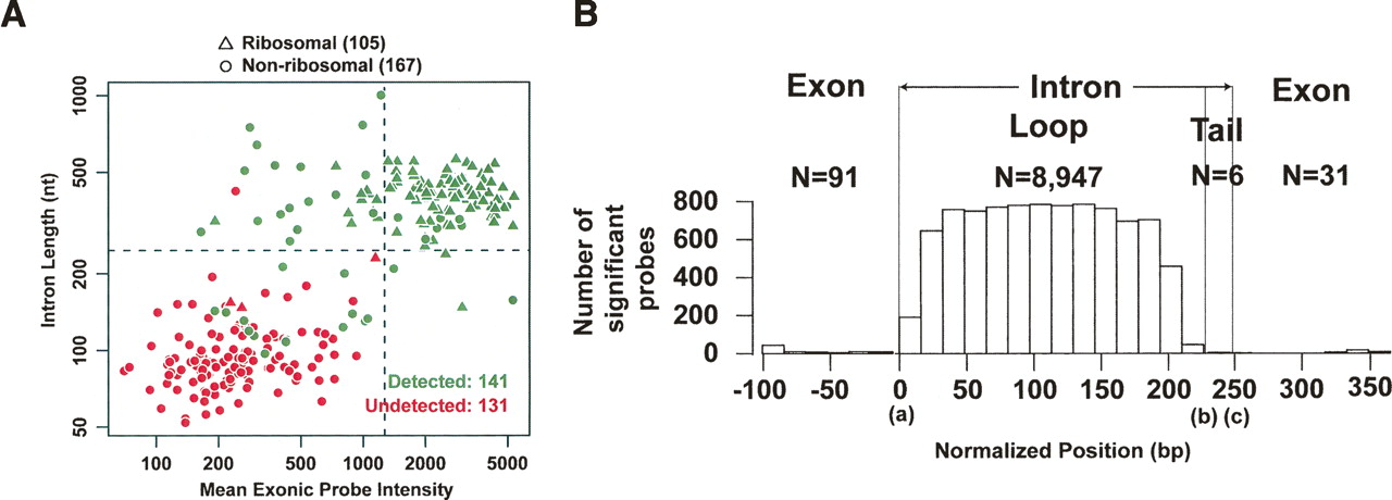 (A) Relationship between gene expression, intron length, and intron detection. Intron-containing genes were categorized as ribosomal (105) and nonribosomal (167); (green) detected introns, (red) undetected introns; (black dashed lines) mean intron length (246 nt) and mean exon probe intensity (1269). (B) Coverage of intronic regions by tiling array probes. Normalized positions of tiling array probes are plotted. (a) 5′ splice site, (b) branchpoint, (c) 3′ splice site.
