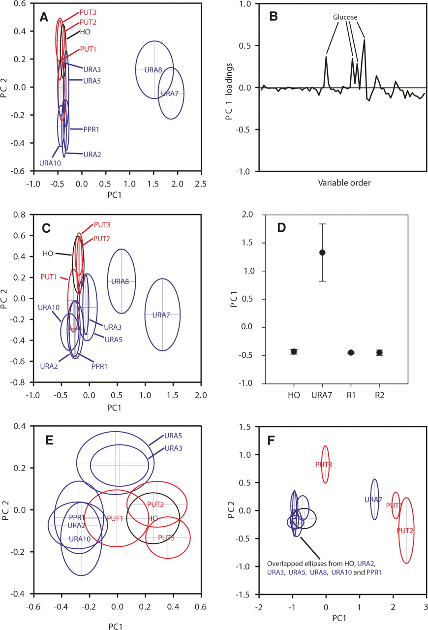 PCA scores plots for the extracellular metabolite profiles. (A) PC1 vs. PC2 scores plot for three mutations affecting genes in proline utilization (PUT1, PUT2, and PUT3; red), seven mutations affecting genes in pyrimidine biosynthesis (URA2, URA3, URA5, URA7, URA8, URA10, PPR1; blue), and a control gene (HO, black) (eight replicate samples for each strain). (B) Loadings plot for the PC1 axis shown in panel A. (C) PC1 vs. PC2 scores plot for the data shown in panel A, recalculated after removing variables containing NMR signals from glucose. (D) Scores plot (PC1) showing that reintroduction of functional URA7 restores a wild-type (hoΔ) metabolic phenotype. (R1) ura7Δ strain with chromosomal reinsertion of URA7 under control of its native promoter, (R2) ura7Δ strain with chromosomal reinsertion of URA7 and its native terminator under control of the native promoter. (E) PC1 vs. PC2 scores plot for the data shown in panel A, recalculated after excluding the ura7Δ and ura8Δ samples. (F) PC1 vs. PC2 scores plot of the same strains grown on minimal medium containing proline rather than ammonium as a nitrogen source (five to six replicate samples for each strain).