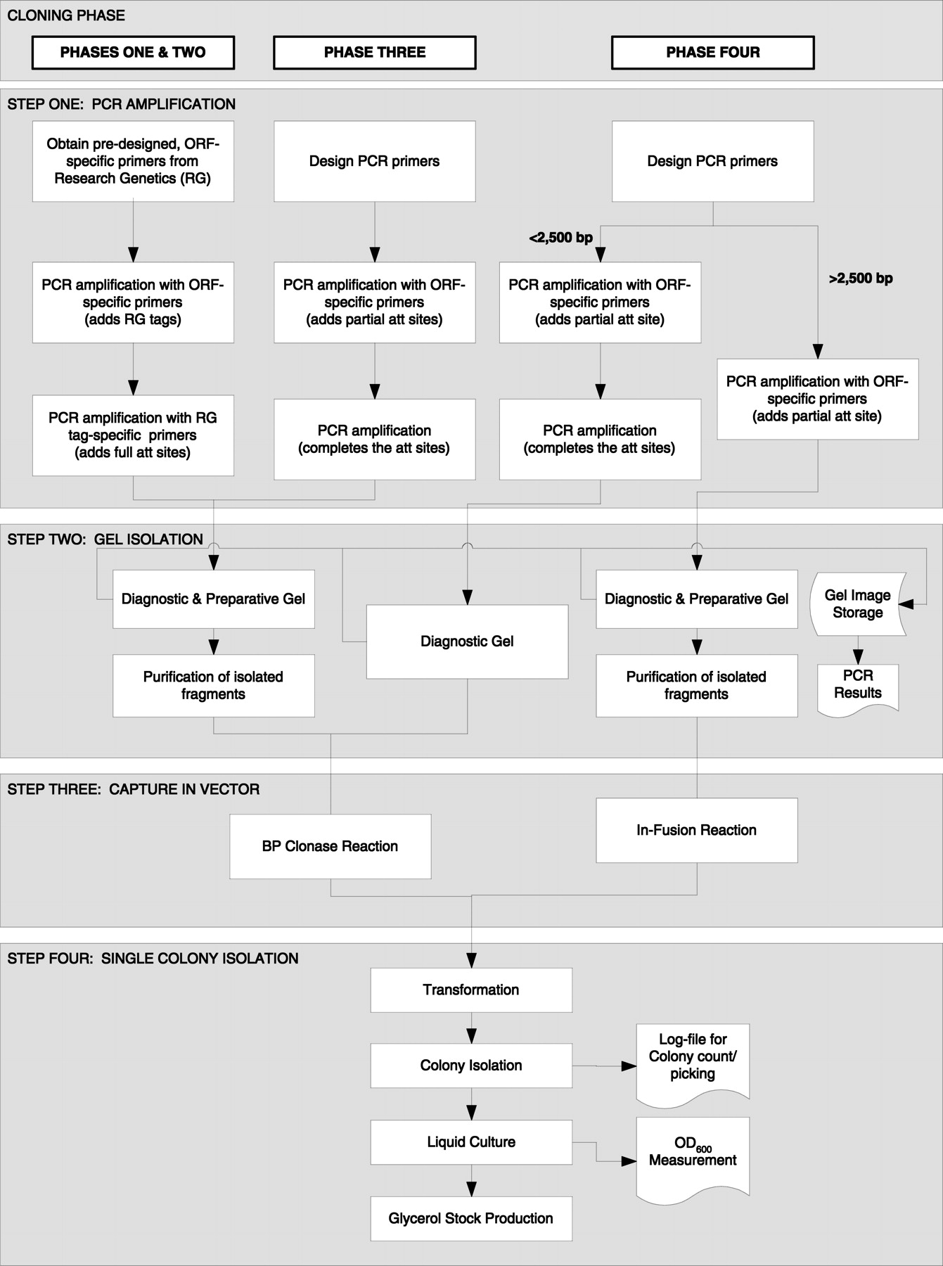 Workflow diagram of clone production. The entire process from the design of primers to production of clone stocks is shown for the four production phases. The process started by designing primers for every ORF in the genome. The primers were used to amplify the ORFs from the genome. Subsequent amplifications with universal primers generated ORF sequences flagged by recombinational cloning sites at either end and were monitored by a diagnostic gel. The product was cloned into a recombinational cloning vector via a BP clonase reaction or In-Fusion reaction. Competent bacterial strains were transformed with the reaction mix to yield colonies that were isolated robotically, cultured in liquid medium, and stored as 15% glycerol stocks.