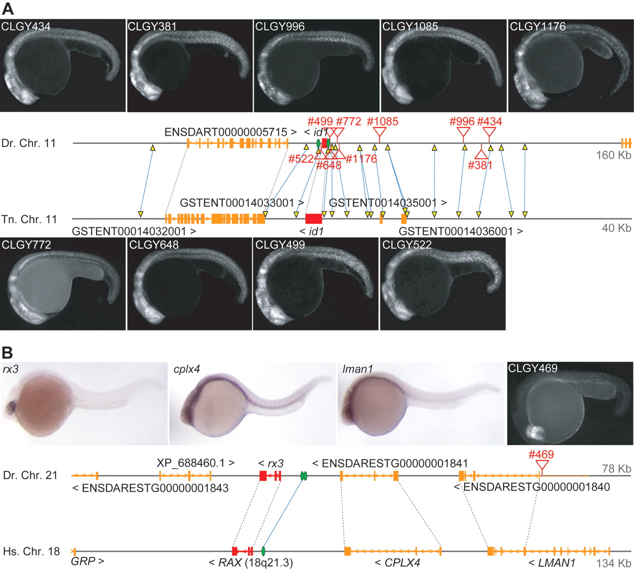 Genomic regulatory blocks are extended regions of cis-regulatory content. (A) Zebrafish id6 locus is orthologous to tetraodon id1, located in a gene desert spanned by conserved noncoding elements (yellow triangles connected with blue lines, corresponding to Ensembl translated BLAT alignments). Two HCNEs are conserved from fish to human id1 loci (green ovals in zebrafish locus). The insertions recovered are labeled as red triangles with transgenic line numbers. Note the same global expression pattern regardless of insertion position (id6 expression pattern in Supplemental Fig. S1). (B) GRB of human RAX and zebrafish rx3 loci, consisting of RAX, CPLX4, and LMAN1 genes. An insertion within lman1, CLGY469, assumes the expression pattern of rx3, not of the gene it is inserted into. While only one HCNE can be discerned in this alignment, multiple elements are found in fish/fish alignments (data not shown).