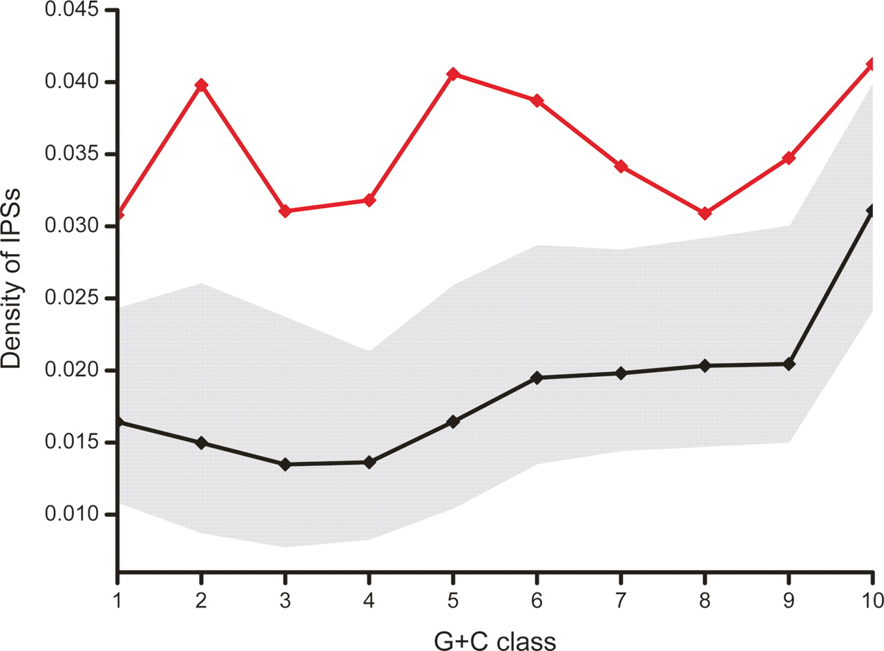 Density of indel-purified segments in macroRNA transcripts. Shown are the IPS densities within macroRNA transcripts (red line) for 10 G+C content bins (horizontal axis), and the expected density based on the intergenic distribution of IPSs (black line; the gray band indicates 95% confidence intervals obtained by randomization; see Methods for details). The IPS densities within macroRNAs exceed significantly the levels expected in G+C-matched intergenic sequence, indicating the past action of purifying selection.