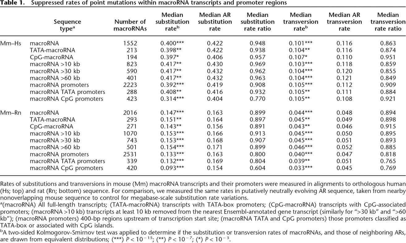 bA two-sided Kolmogorov-Smirnov test was applied to determine if the substitution or transversion rates of macroRNAs, and those of neighboring ARs, are drawn from equivalent distributions; (***) P < 10−15; (**) P < 10−7; (*) P < 10−3.