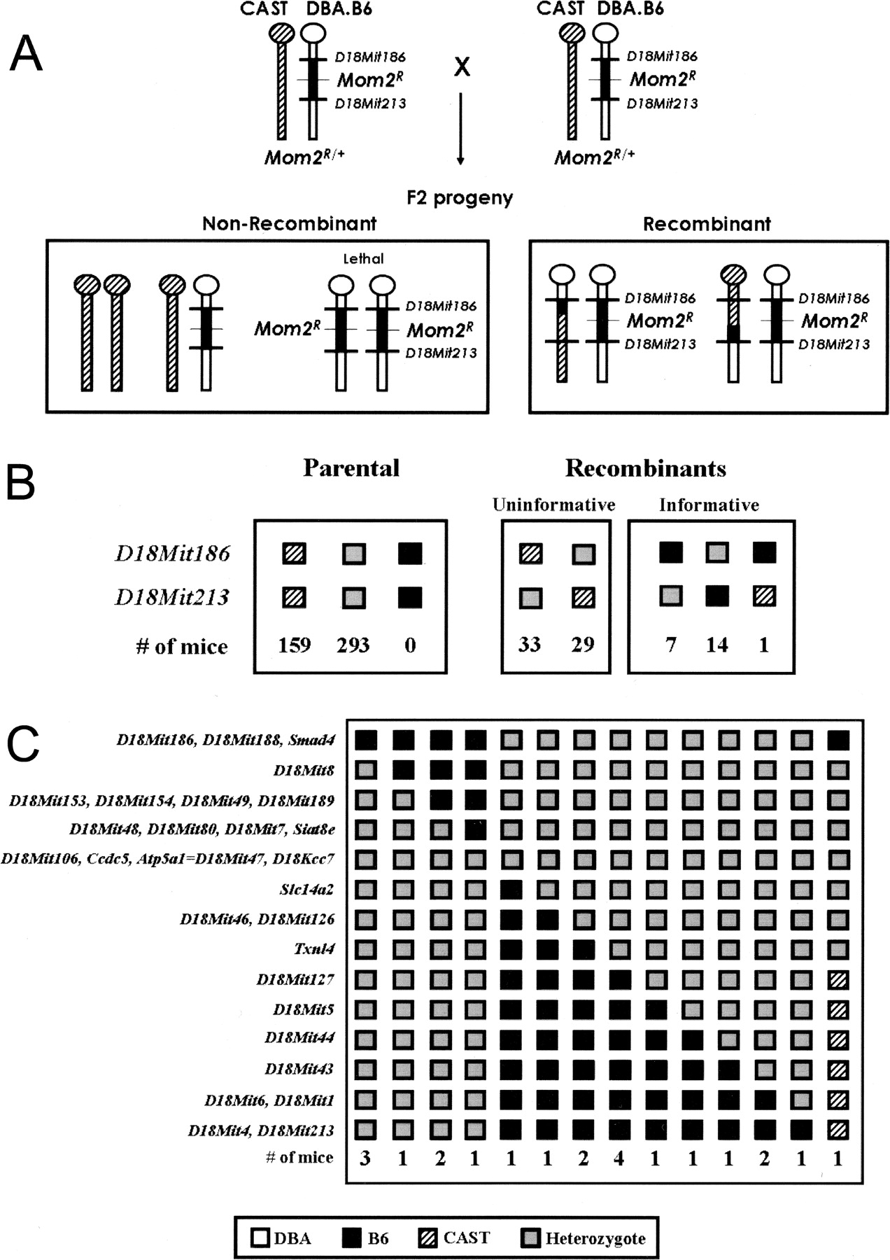 Exclusion mapping strategy to refine the Mom2 locus. (A) Based on the observation that the Mom2R locus encodes a recessive embryonic lethal mutation, we devised a strategic intercross of (CAST × DBA.B6 Mom2R/+)F1 mice to limit the boundaries of the Mom2 locus. Since mice homozygous for the B6 Mom2R allele (B/B) should not survive, markers within the Mom2 region that were homozygous for B6 alleles would be excluded. DBA.B6 Mom2R/+ animals from the N7–N8 generations were mated to CAST mice. DBA chromosomes are shown in white; the B6 Mom2R region is shown in black; CAST chromosomes are represented by diagonal stripes and heterozygotes are shown in gray. The possible F2 progeny are shown in black boxes; all offspring were genotyped for proximal (D18Mit186) and distal (D18Mit213) markers flanking Mom2 (Silverman et al. 2002, 2003). (B) The number of resulting F2 progeny are shown below the boxes. Nonrecombinant F2 progeny are in the black box on the left; representative recombinant progeny are in the boxes to the right. F2 offspring that were B/B at either the proximal (D18Mit186) or distal (D18Mit213) marker and were B/C or C/C at the other, indicated the occurrence of a recombination within the Mom2 region. Nonrecombinant CAST DBA.B6 Mom2R animals were uninformative for linkage analysis. (C) Haplotype analysis of recombinant F2 animals from the [CAST × DBA.B6 Mom2R/+]F1 intercross. Mapped loci are listed on the left. Numbers below each column of boxes represent the number of F2 progeny that fall into each haplotype. F2 progeny were identified that were B/B at either the proximal or distal marker, and were B/C or C/C at the other, indicating an informative recombinant within the Mom2 region; these 22 mice were genotyped by PCR for polymorphic markers within the Mom2 region. This analysis positioned Mom2 between the D18Mit7 locus and the Slc14a2 gene.