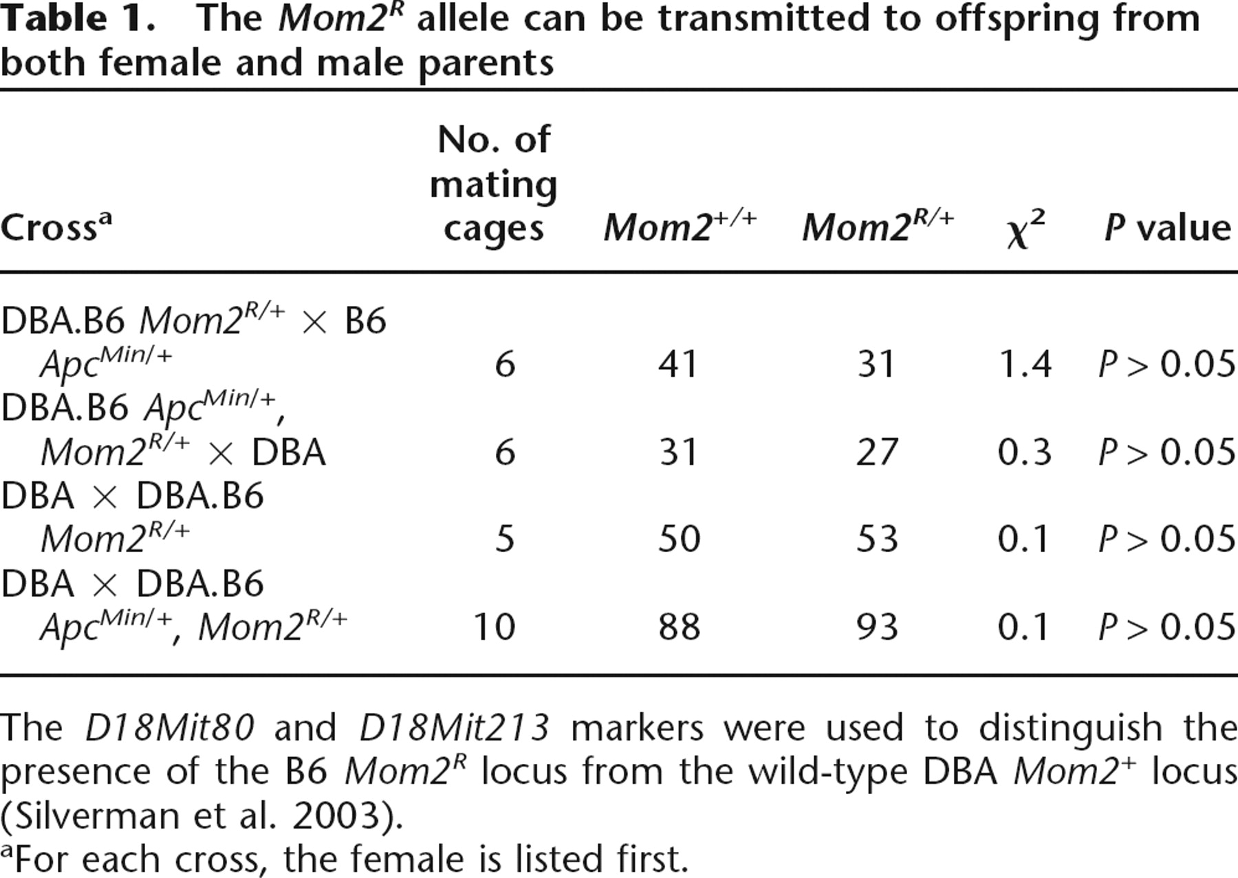 The D18Mit80 and D18Mit213 markers were used to distinguish the presence of the B6 Mom2R locus from the wild-type DBA Mom2+ locus (Silverman et al. 2003).