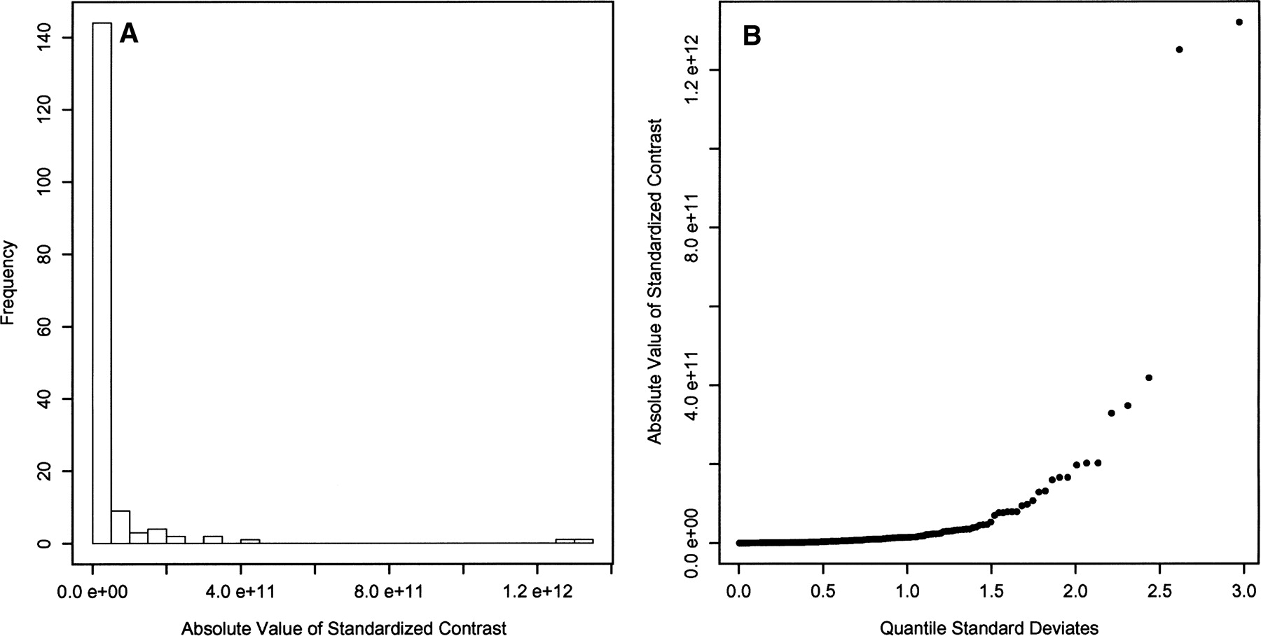 (A) Distribution of the absolute value of the standardized contrasts from the 18S rDNA tree showing a strong deviation from the right one-half normal positive distribution expected from a phenotypic trait under Brownian evolution. A strong deviation would be expected for a trait under proportional evolution. (B) Quantile distribution of the absolute value of the standardized contrasts. These contrasts do not show a near-linear relationship to the positive quantile standard deviates, indicating a strong deviation from a right one-half normal positive distribution. This is expected for a trait under proportional evolution.