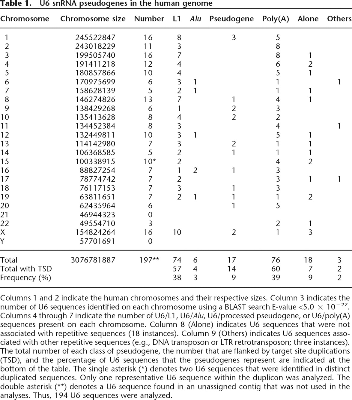 Columns 1 and 2 indicate the human chromosomes and their respective sizes. Column 3 indicates the number of U6 sequences identified on each chromosome using a BLAST search E-value <5.0 × 10−27. Columns 4 through 7 indicate the number of U6/L1, U6/Alu, U6/processed pseudogene, or U6/poly(A) sequences present on each chromosome. Column 8 (Alone) indicates U6 sequences that were not associated with repetitive sequences (18 instances). Column 9 (Others) indicates U6 sequences associated with other repetitive sequences (e.g., DNA transposon or LTR retrotransposon; three instances). The total number of each class of pseudogene, the number that are flanked by target site duplications (TSD), and the percentage of U6 sequences that the pseudogenes represent are indicated at the bottom of the table. The single asterisk (*) denotes two U6 sequences that were identified in distinct duplicated sequences. Only one representative U6 sequence within the duplicon was analyzed. The double asterisk (**) denotes a U6 sequence found in an unassigned contig that was not used in the analyses. Thus, 194 U6 sequences were analyzed.