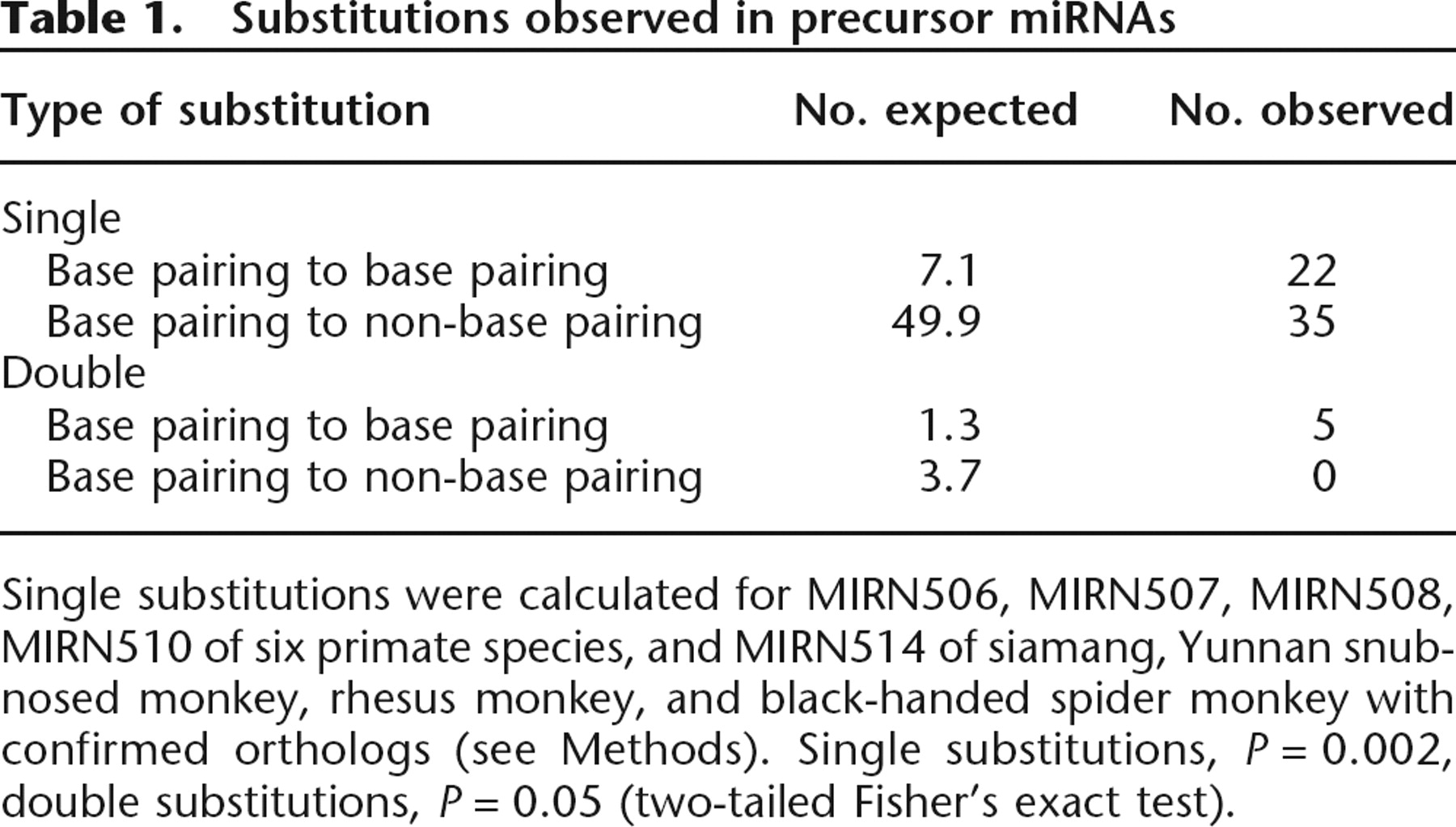 Single substitutions were calculated for MIRN506, MIRN507, MIRN508, MIRN510 of six primate species, and MIRN514 of siamang, Yunnan snub-nosed monkey, rhesus monkey, and black-handed spider monkey with confirmed orthologs (see Methods). Single substitutions, P = 0.002, double substitutions, P = 0.05 (two-tailed Fisher’s exact test).