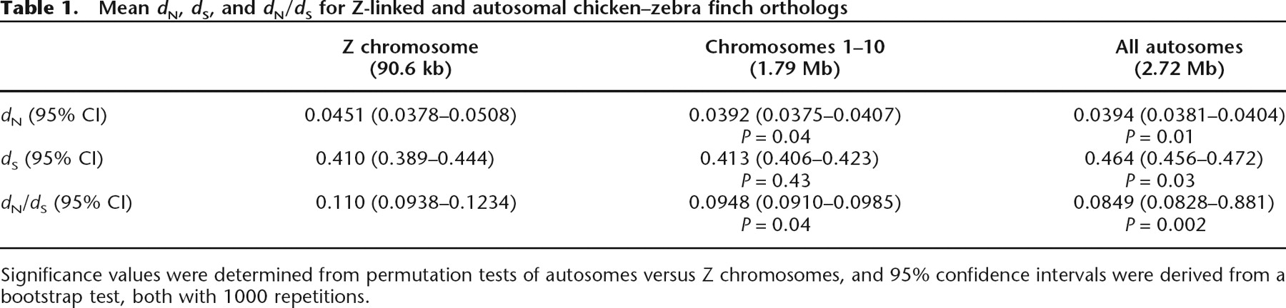 Mean dN, dS, and dN/dS for Z-linked and autosomal chicken–zebra finch orthologs