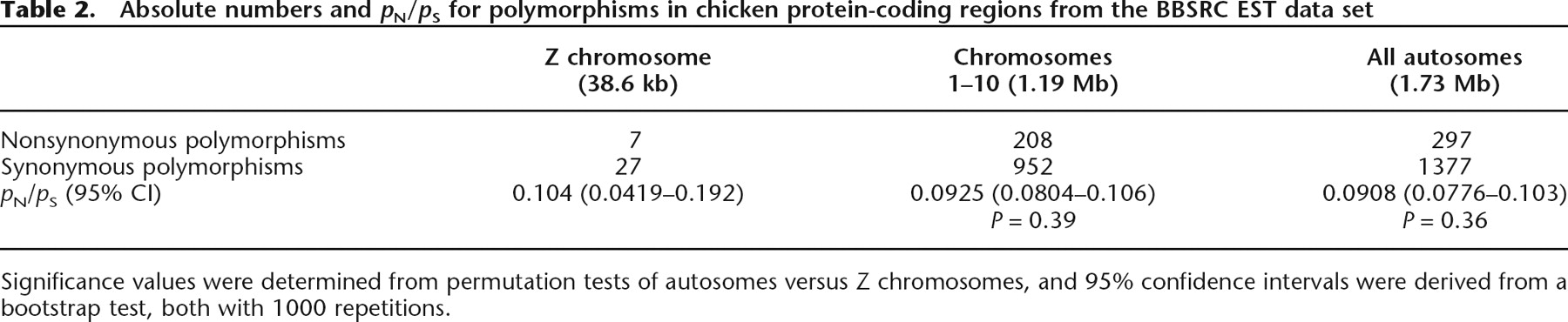 Absolute numbers and pN/pS for polymorphisms in chicken protein-coding regions from the BBSRC EST data set