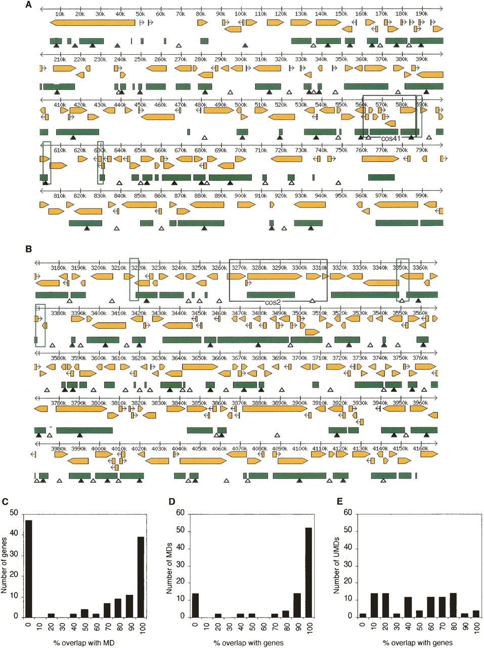 Methylated domains (MDs) within two 1-Mb genomic regions from chromosome 7q (A) and chromosome 4q (B) colocalize with transcription units. MDs (green bars) were inferred from CpG[o/e] ratios as described in the text. The inferred pattern was experimentally verified by methylation-sensitive PCR at sites marked by closed triangles (methylated) and open triangles (unmethylated). Yellow arrows show the size and orientation of predicted transcription units. The positions of bisulfite sequenced cosmid inserts cos41 and cos2 (see Fig. 1) are shown by black boxes. Green boxes indicate regions that were bisulfite sequenced in order to test the accuracy of predicted unmethylated domain (UMD)/MD boundaries (Supplemental Fig. 2). (C) Frequency of predicted genes that overlap to varying degrees with MDs. (D) Frequency of MDs that overlap to varying degrees with predicted genes. (E) Frequency of UMDs with gene overlap.