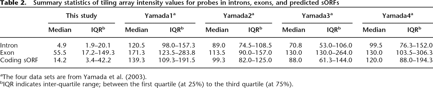 Summary statistics of tiling array intensity values for probes in introns, exons, and predicted sORFs
