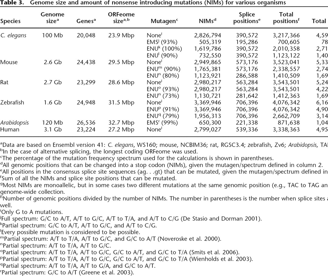 dAll genomic positions that can be changed into a stop codon (NIMs), given the mutagen/spectrum defined in column 2.