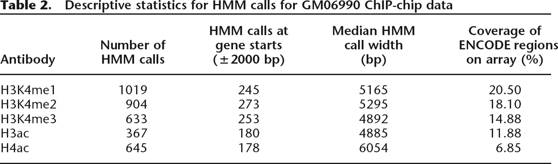 Descriptive statistics for HMM calls for GM06990 ChIP-chip data