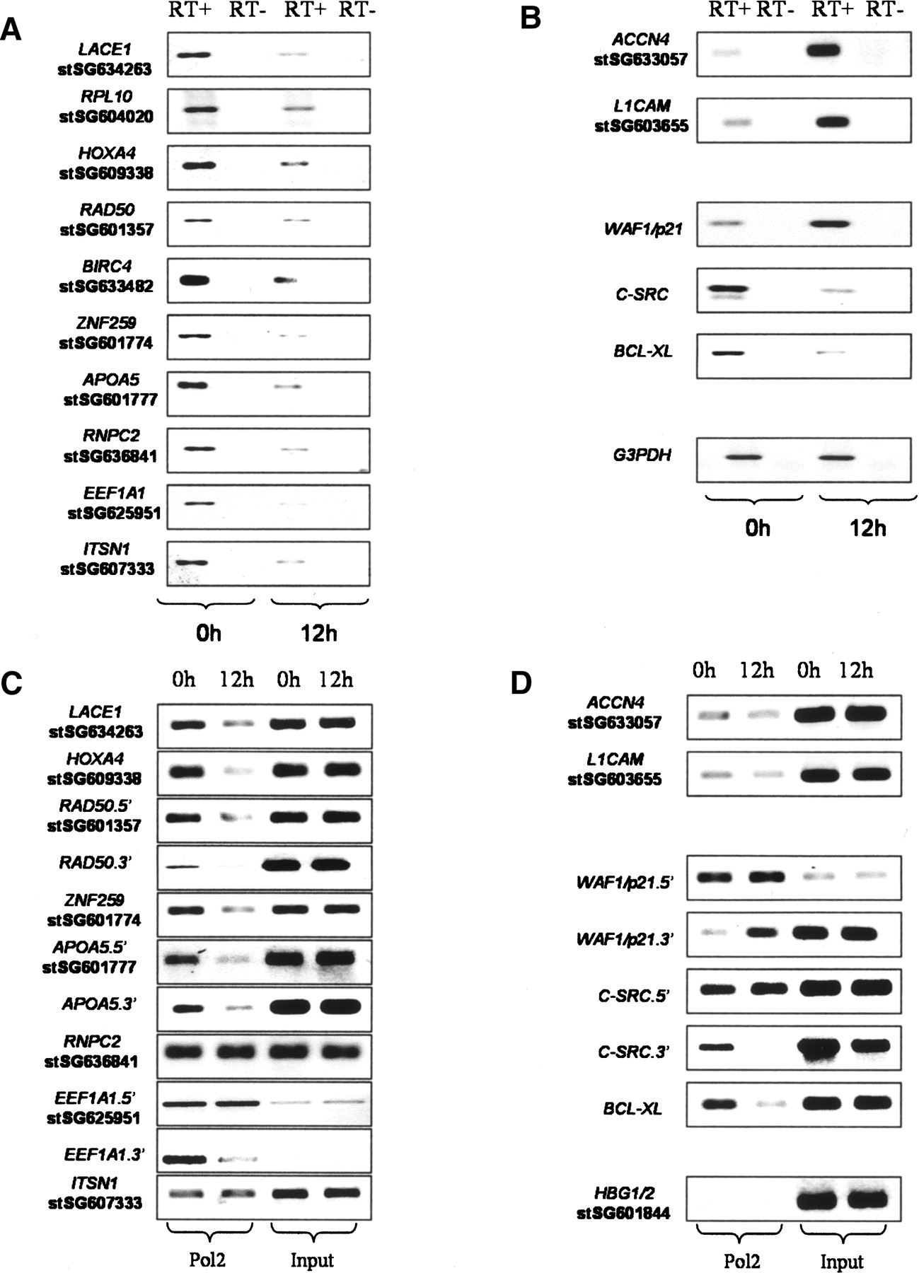 Histone deacetylation at promoter regions results in decreased expression of the associated genes mediated at the transcriptional level. RNAs were prepared from cells that were either untreated (0 h) or treated with 5 mM Na-butyrate for 12 h. Total RNA (1 μg) was used for preparing gene-specific cDNAs using reverse transcriptase (RT), which were analyzed by RT–PCR to investigate the RNA levels of genes displaying histone deacetylation (A), while genes with increased acetylation, genes from the literature, and a loading control (GAPDH) are presented in B. Similar results were obtained in a biological replicate or when cDNAs were obtained using oligo(dT). ChIPs were prepared from cells that were either nontreated (0 h) or treated with 5 mM Na-butyrate for 12 h using an antibody against the C-terminal domain of POLR2A. The analyzed regions included most from Supplemental Table 1, divided into those with histone deacetylation (C) and with histone hyperacetylation from previous literature or serving as negative control (HBG1/2) (D). For some genes, two different genomic regions were analyzed, one close to the TSS (Supplemental Table 1) is indicated by the gene name, followed by 5′, while an intragenic region was analyzed using the same primers used in A and B and is indicated by the gene name, followed by 3′. Similar results were obtained in two other biological replicates.