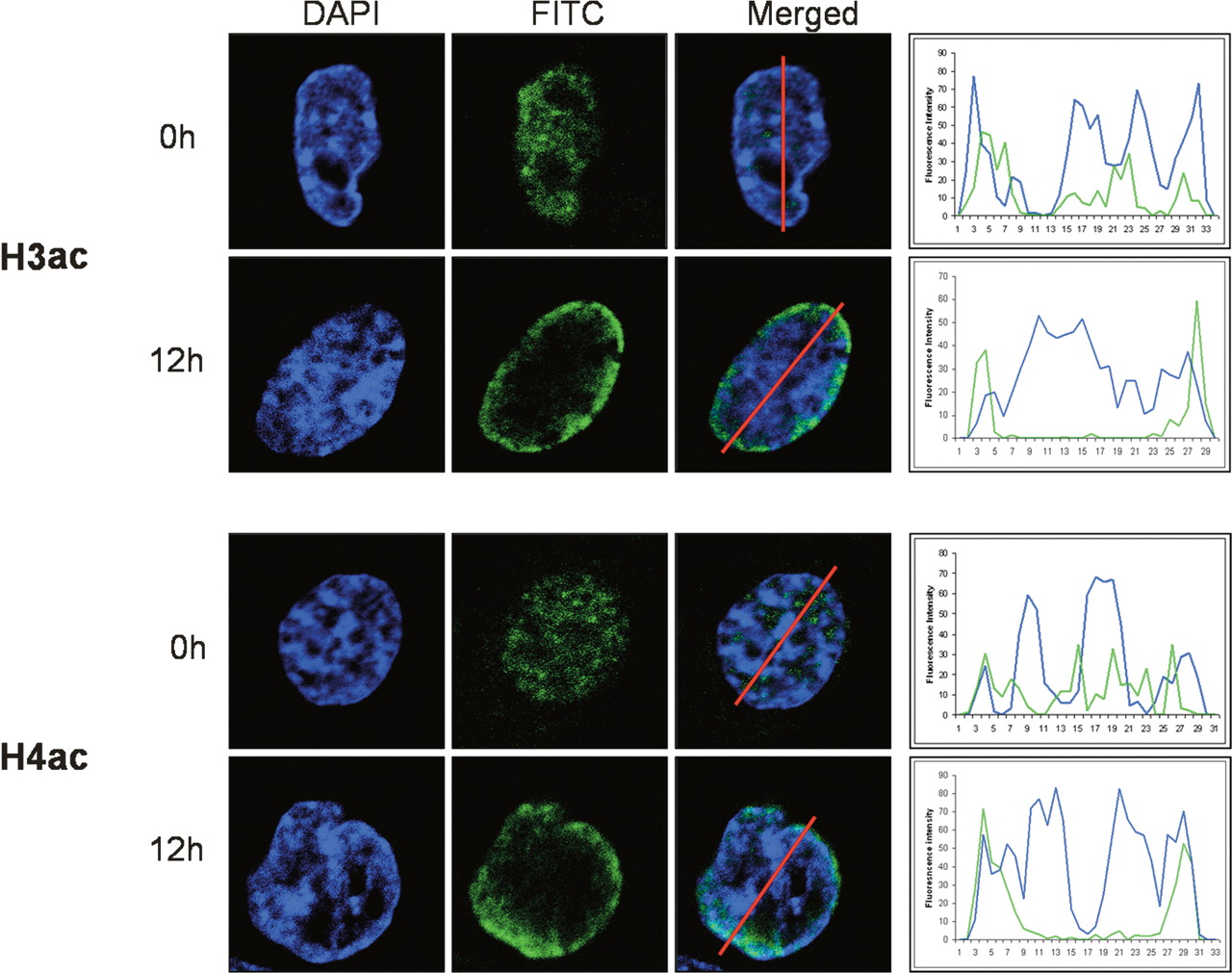 Butyrate-mediated increase in total levels of acetylated histones preferentially occurs at the nuclear periphery. HepG2 cells were either untreated (0 h) or treated with 5 mM Na-butyrate for 12 h, and immunostaining assays were performed under both conditions using antibodies against H3ac (top) and H4ac (bottom) and secondary antibody coupled to FITC. From left to right are presented the staining patterns observed for DAPI in blue, FITC in green, and when both stainings are merged. The graphs to the right represent the signal quantification obtained for both DAPI and FITC along the red line drawn in the merged picture. The images represent the overall picture emerging from two biological replicates (Supplemental Fig. 3).
