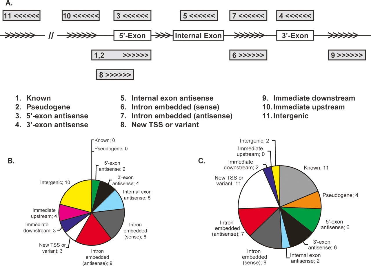 Classification of validated promoters with respect to the nearest GENCODE-annotated gene. Exons are indicated by boxes and arrows indicate the 5′ to 3′ direction. (A) (1) Known: the promoter appears within 1 kb upstream of the first exon of any variant of the gene and the transcribed strand is the same as the gene. In case of RACE, the sequence, if spliced, should match the gene splice sites. (2) Pseudogene: like known, but the gene is a pseudogene. (3) 5′-Exon anti-sense: The promoter is within 1 kb of the first exon of some variant of the gene and the transcription is anti-sense to the gene. The transcripts if not present or if short, should at least have a reasonable potential to overlap the exon. (4) 3′-Exon anti-sense: like 5′-exon anti-sense but for the last exon of some variant. (5) Internal exon anti-sense: like 5′-exon anti-sense but for an internal exon. (6) Intron embedded (sense): The promoter overlaps the gene span and transcription is on the same strand as the gene, but the transcripts do not appear to interact with any exons from any variant. (7) Intron embedded (anti-sense): like (5) but for anti-sense direction. (8) New TSS or variant: Transcription is on the same strand as the gene, and the transcribed product overlaps one or more exons of some variant but does not share the same splice sites. (9) Immediate downstream: The promoter is within 2 kb downstream of the last exon and transcription is on the same strand, but the transcripts do not overlap any exons of any variant of the gene. (10) Immediate upstream: The promoter is within 2 kb upstream of the first exon and transcription is on the opposite strand and the transcripts cannot overlap with the first exon of any variant. (11) Intergenic: >2 kb away from any annotated transcript. (B) The 41 regions validated by transient transfection assays. The total number of cases is 48, as some classes (notably intron embedded) can be interpreted as other classes (e.g., new TSS or anti-sense). (C) The 49 regions validated by 5′-RACE. The total number of cases is 59.