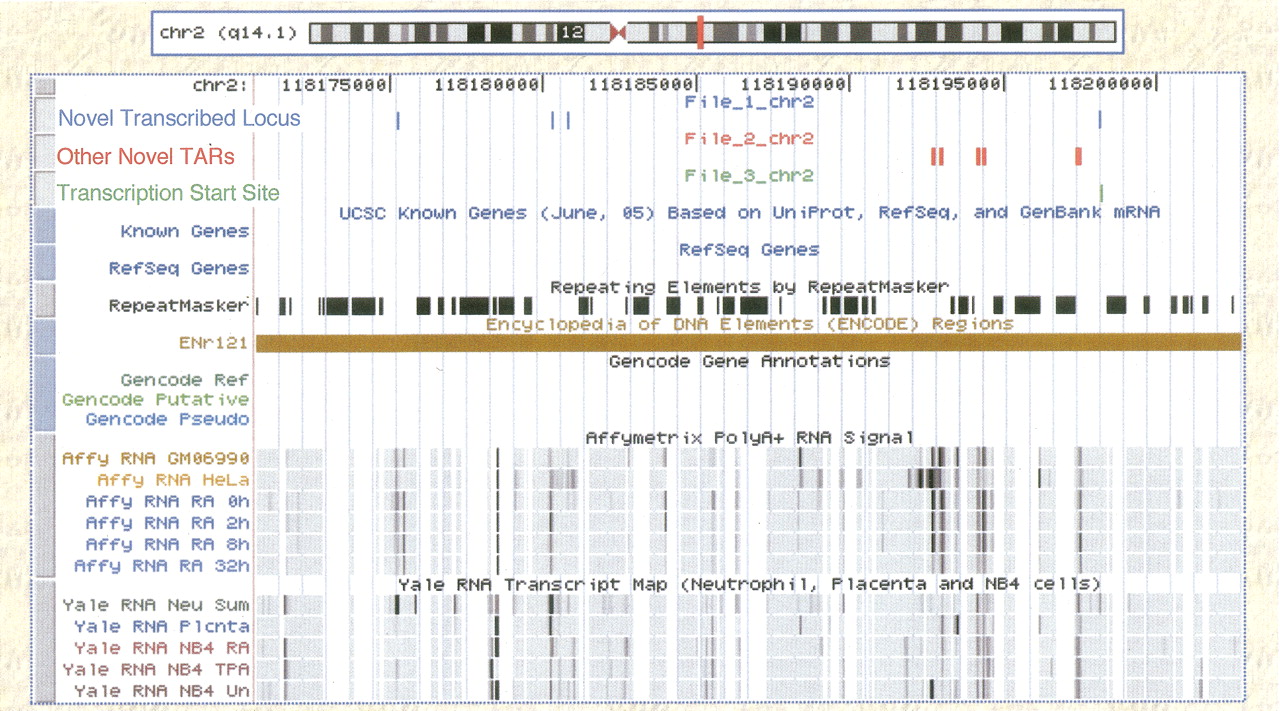 Plot of a novel transcribed locus identified using the expression profile (the clustered TARs are shown in blue). Other novel TARs that are not part of this cluster are shown in red. In green we see the overlap of a putative transcription start site with the likely 5′ end of this cluster. There are no annotated transcripts in the region displayed (chr 2 from 118,175,232 to 118,198,192, NCBI Build 35). We also observe transcript maps for the 11 different cell lines and conditions (not all novel TARs are shown in this region).
