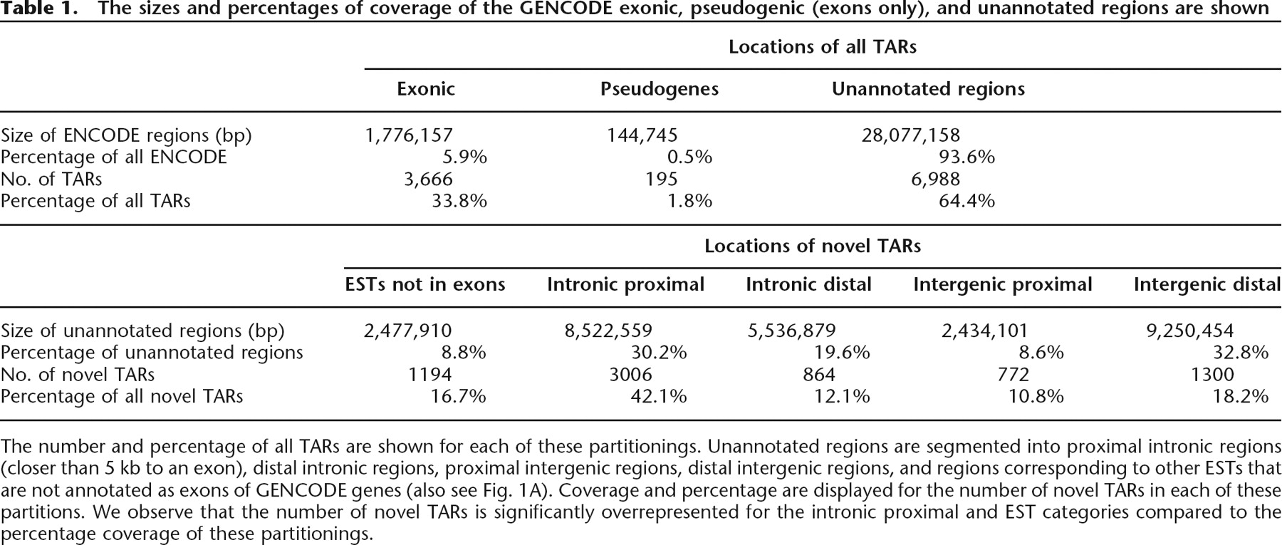 The number and percentage of all TARs are shown for each of these partitionings. Unannotated regions are segmented into proximal intronic regions (closer than 5 kb to an exon), distal intronic regions, proximal intergenic regions, distal intergenic regions, and regions corresponding to other ESTs that are not annotated as exons of GENCODE genes (also see Fig. 1A). Coverage and percentage are displayed for the number of novel TARs in each of these partitions. We observe that the number of novel TARs is significantly overrepresented for the intronic proximal and EST categories compared to the percentage coverage of these partitionings.