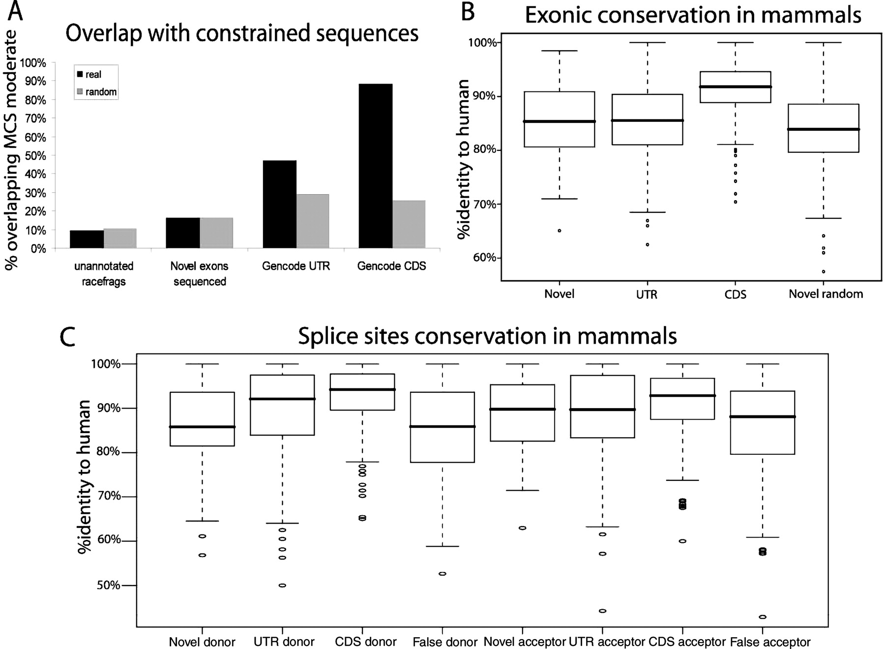 Evolutionary conservation of RACEfrags. (A) Overlap of four data sets with constrained sequences. For each dataset, the percentage of projected (black) and random objects (gray; same sizes as real objects but randomly distributed in nonrepeated regions and unannotated for RACEfrags or novel exons) overlapping MCS (Multi-species Conserved Sequences)-constrained sequences by at least one nucleotide are represented on the Y-axis. Please note that GENCODE UTR and GENCODE CDS show an overlap with MCS significantly greater than random sequences. (B) Exonic conservation in mammals. For each dataset, a boxplot depicting the distribution of nucleotide conservation scores is shown. Conservation is computed as the percent identity to the human sequence for the entire length of the feature. The heavy black line marks the median score, the box contains the second and third quartiles, and whiskers mark the fifth and ninety-fifth percentiles. Novel random features are randomly chosen from unannotated nonrepetitive regions that exhibit the same size distribution as novel exons. For CDS features, a random nonredundant subset of GENCODE-annotated known coding exons was used. The CDS exons are significantly more conserved than the other features. Note that the novel sequenced exons and GENCODE UTR exons are significantly more conserved than random sequences (Novel random). (C) Splice sites conservation in mammals. For each data set, donor sequences (−2 to +6 with respect to the 5′ splice junction) and acceptor sequences (−6 to +2 with respect to the 3′ splice junction) were scored for conservation to the human splice site sequence. Boxplots were produced as in B. False splice sites were picked at random from the set of all GT or AG dinucleotides in ENCODE regions that do not overlap GENCODE-annotated exons or repeats. UTR and CDS donors and CDS acceptors are significantly more conserved than false splice sites (random GT or AG). Novel splice sites do not exhibit elevated conservation over background.