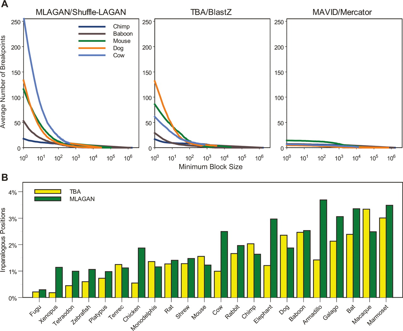 Rearrangements and duplications inferred by the alignments. (A) Number of rearrangement breakpoints in the ENCODE regions as a function of minimum block size, determined by three alignment methods. For each species, the average number of breakpoints over all regions (Y-axis) was calculated for all minimum block sizes (in base pairs; X-axis). The species shown are chimp (dark blue), baboon (brown), mouse (green), dog (orange), and cow (light blue). For each minimum block size, the number of breakpoints in a given region was determined after removing blocks in order of increasing size and joining consistent blocks until no block had size less than the minimum (see Methods). (B) Duplicated human nucleotide positions in the ENCODE regions. The fraction of ENCODE positions that are inparalogous to one another relative to a given species is plotted for each species, as determined by TBA (yellow) and MLAGAN (green). Colobus Monkey, Dusky Titi, Mouse Lemur, and Owl Monkey are not shown because sequence from these species was only obtained for one region (ENm001).