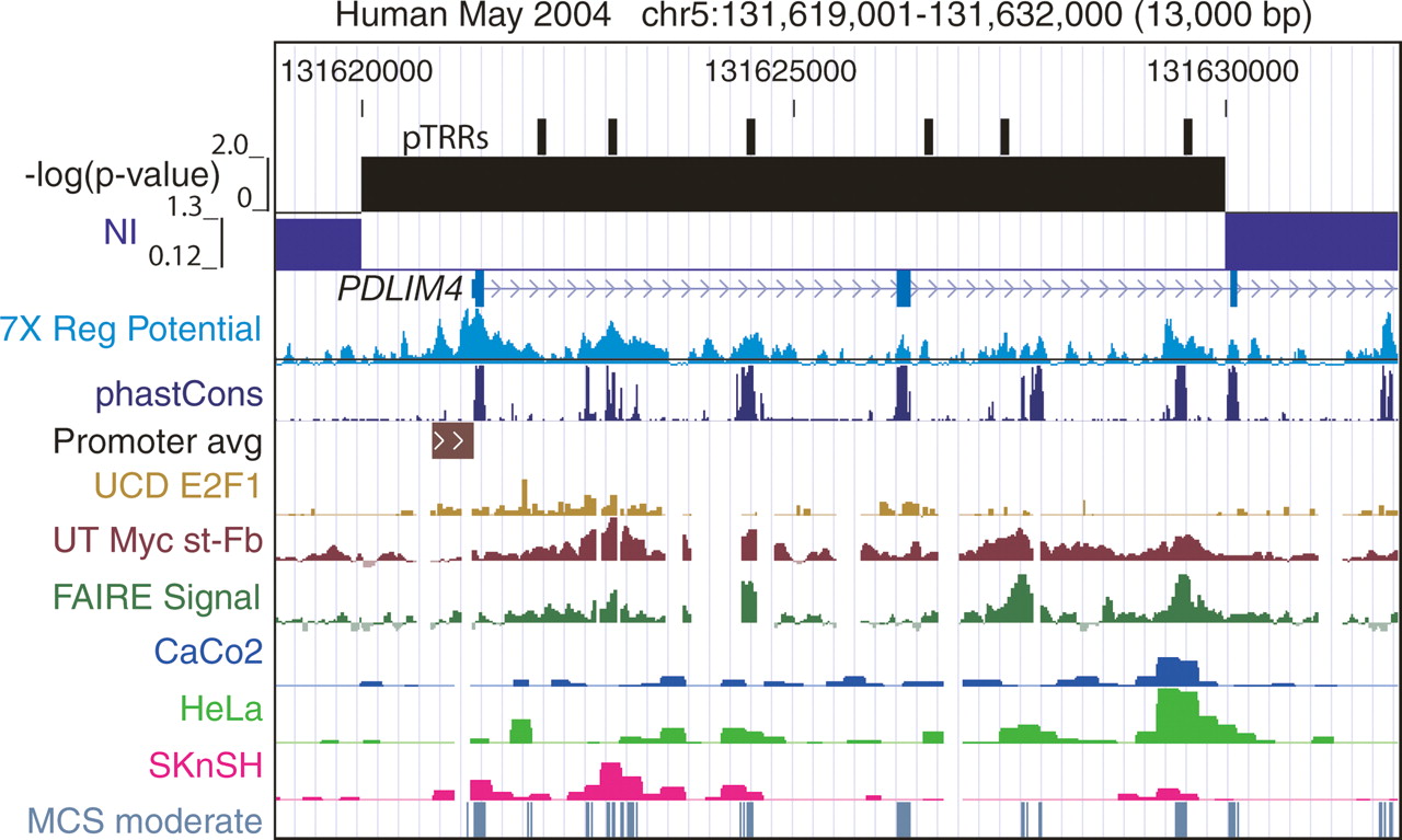 Recent positive selection in the PDLIM4 gene. The customized view from the UCSC Genome Browser covers about 13 kb of ENCODE region ENm002 centered at gene PDLIM4. It shows the locations of pTRRs, the P-value for deviation from neutrality for 10-kb windows (H. Lawson, J. Martin, D.C. King, B. Giardine, W. Miller, and R.C. Hardison, in prep.), the neutrality index (Rand and Kann 1996; with values >1 implying negative selection and values <1 implying positive selection), positions of known genes, regulatory potential scores (Taylor et al. 2006), phastCons scores (Siepel et al. 2005), active promoters (Cooper et al. 2006), occupancy by E2F1 (Bieda et al. 2006), occupancy by c-Myc (Kim et al. 2005), formaldehyde-assisted isolation of regulatory elements (FAIRE) (Giresi et al. 2007), DNaseI hypersensitive sites measured in CaCo2, HeLa, SKnSH cell lines/phenotypes (Sabo et al. 2006), and moderate MCSs generated by the ENCODE Multispecies Analysis group (Margulies et al. 2007).