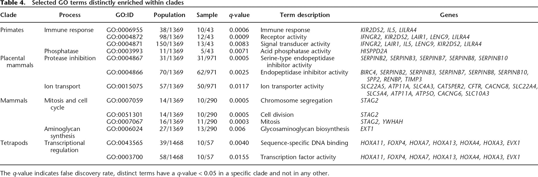 The q-value indicates false discovery rate, distinct terms have a q-value < 0.05 in a specific clade and not in any other.
