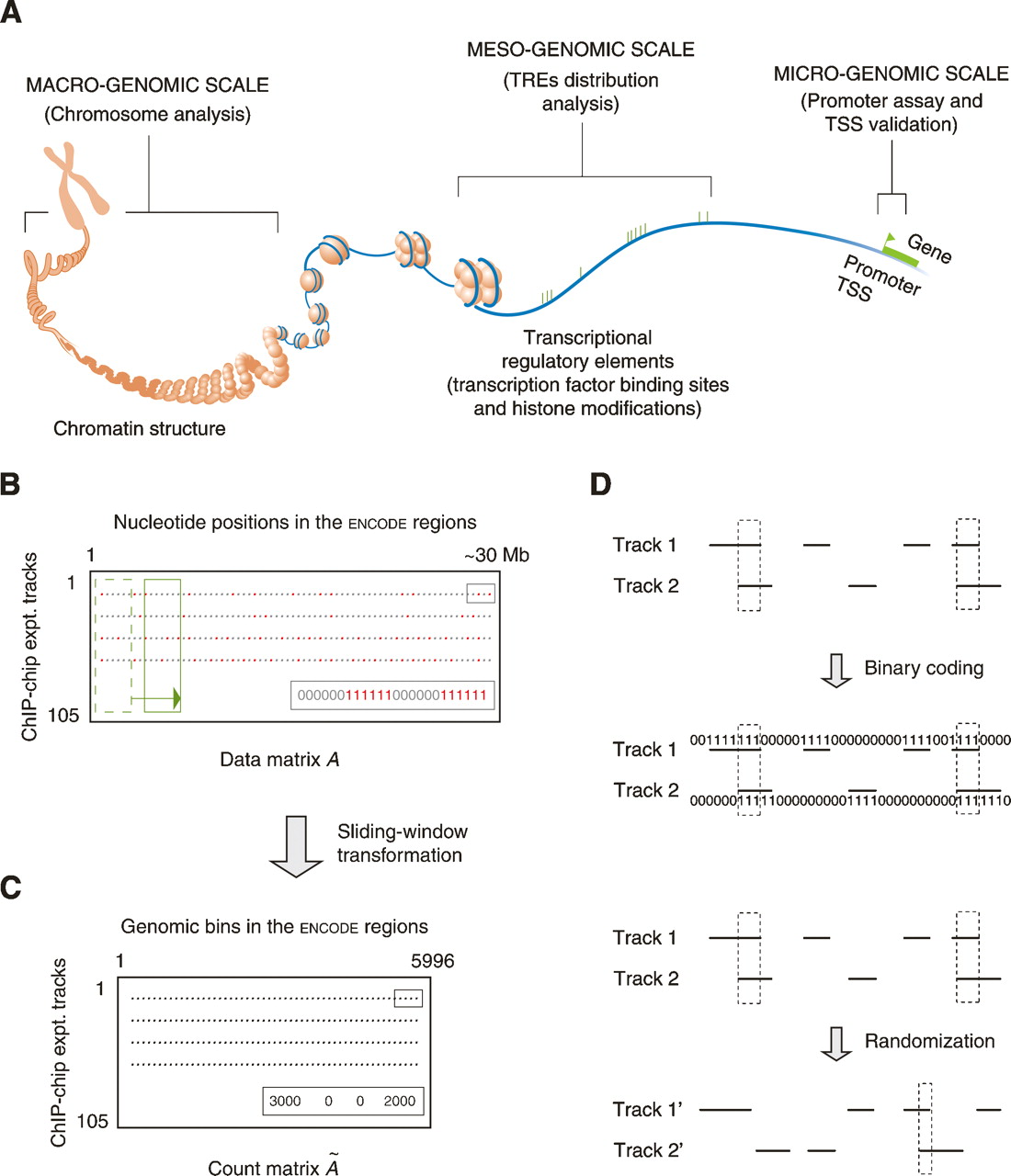 Schematic introduction of the several concepts used in this study. (A) Studies of different transcription factors and their regulatory elements on various genomic levels. (TRE) Transcriptional regulatory element; (TSS) transcription start site. (Modified from The ENCODE Project Consortium 2004 and reprinted with permission from AAAS [www.sciencemag.org] © 2004.) (B) The binary data matrix. Each row is the result track of a ChIP–chip experiment. Red dots are identified transcriptional regulatory elements, in which each nucleotide position is coded as one. (C) The count matrix. A sliding window (the green boxes in B) was used to incorporate contextual information from neighboring positions. Each gray dot represents the number of nucleotide positions in TREs in a sliding window. (D) Correlating two ChIP–chip tracks. The correlation can be done on either two binary vectors or two corresponding count integer vectors (actually used, not shown). Two tracks can also be randomized to generate a background distribution of the correlation.