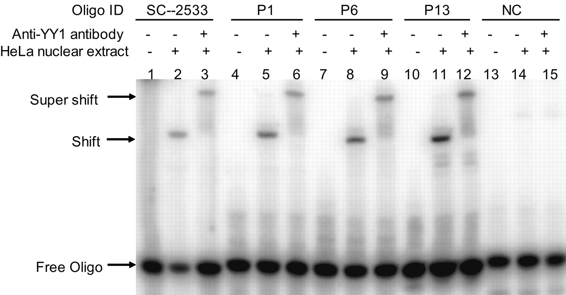 EMSA of YY1 binding to the predicted YY1 motif. Oligo SC-2533 was used as the positive control and NC stands for negative control. HeLa nuclear extract was the source for the YY1 protein. Anti-YY1 mouse IgG was used for the super-shift reactions. The mobility shift and super shift of the oligos demonstrate the specific binding of YY1 to YY1 motif. The EMSA shown was a phosphorimage of the gel.