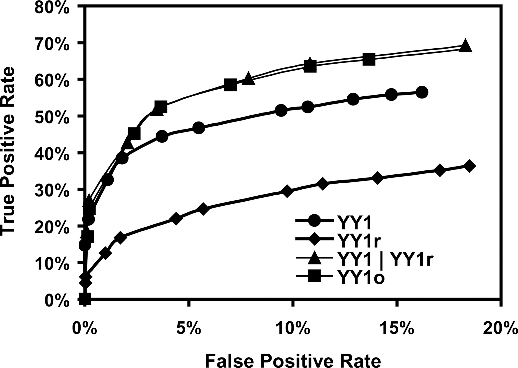 The YY1 PSSM accurately predicts ChIP hits. The YY1 PSSM was searched against probe-covered regions of the 765 ChIP hits (true positives) and the 10,000 probe-covered regions with the lowest ChIP signal (true negatives). True positive rates were plotted against the false positive rates at various P-value cutoffs. (YY1) YY1 motif on the plus strand; (YY1r) YY1 motif on the minus strand; (YY1/YY1r) YY1 motif on either the plus or the minus strand; (YY1o) YY1 motif after optimization in ROVER algorithm on either the plus or the minus strand.