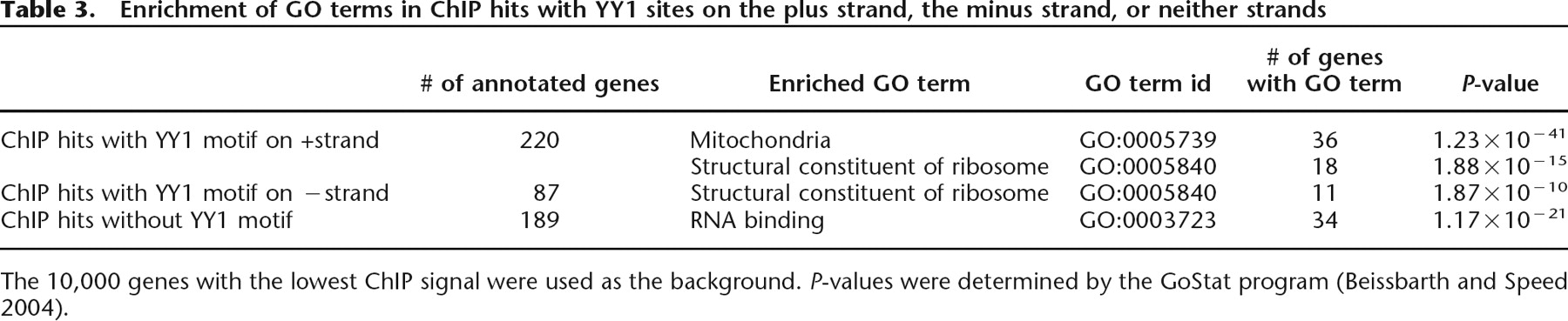 Enrichment of GO terms in ChIP hits with YY1 sites on the plus strand, the minus strand, or neither strands