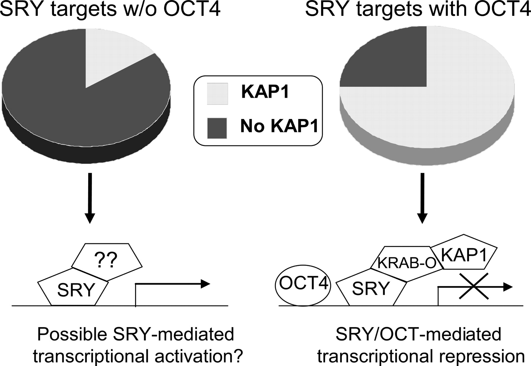 OCT4, SRY, and KAP1 bind to a common set of target promoters. Using OCT4 and SRY ChIP-chip experiments from the same set of cross-linked Ntera2 cells, 880 of the SRY targets were classified as SRY+ and OCT4+ because of their presence in the top 2000 ranked promoters from both lists. To identify the SRY+ and OCT4− promoters, the top 2000 SRY targets were ranked according to their OCT4 enrichment values, and the bottom 389 promoters were chosen. Then, these two sets of promoters (SRY+ OCT4+ and SRY+ OCT4−) were compared to the top 1000 KAP1 targets.