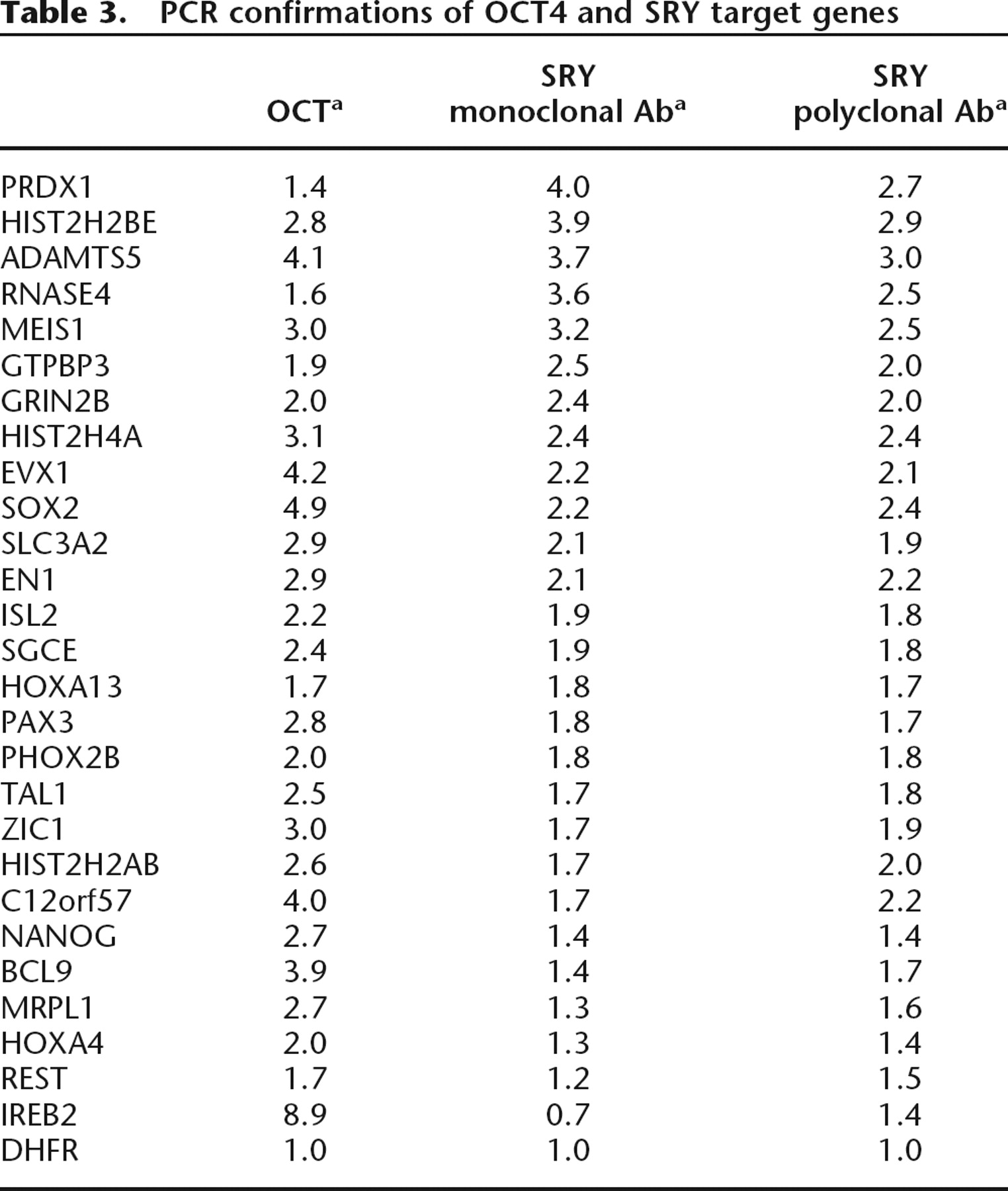 Two different antibodies were used to prepare SRY ChIP samples for confirmation PCR assays; the targets in this list were identified originally by ChIP-chip using the SRY polyclonal antibody.