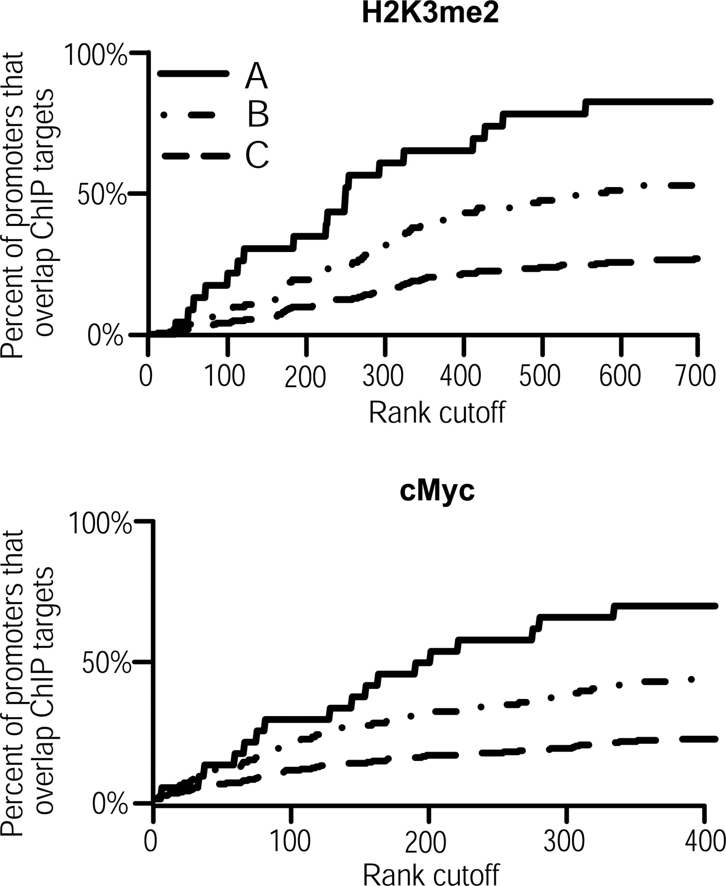 The fraction of promoters that overlap at least 1 bp with a set of ranked ChIP-chip target lists is plotted on the y-axis (see Methods for details). (A) Percent overlap of bidirectional promoters; (B) twice the percent overlap of unidirectional promoters; (C) percent overlap of unidirectional promoters. Both H3K4me3 and MYC overlap more with bidirectional promoters than twice the overlap of unidirectional promoters.