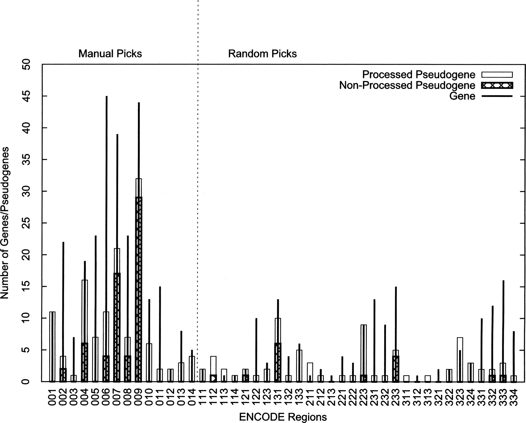 The distribution of genes and the final 201 consensus pseudogenes within 44 ENCODE regions. Both genes and pseudogenes were concentrated in the manually picked regions (001–014).
