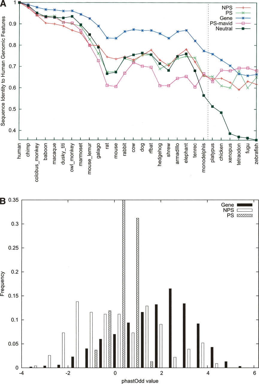 ENCODE pseudogenes overall exhibit a characteristic pattern of neutral evolution. (A) The orthologous sequences of each human genomic component (e.g., pseudogene) were retrieved from MSA data, and pairwise nucleotide sequence identity was calculated. Shown here are the means for each type of components (data labeled as in Fig. 4). A line representing neutral evolution is also shown using data derived from fourfold degenerate sites. (B) A score based on the log-likelihood of observing a genomic fragment under a model of constrained versus neutral evolution was computed for individual exons of genes or pseudogenes using the phastOdds program (Siepel et al. 2005). These scores were then normalized by exon length and plotted here as a histogram. A value near zero or negative indicates that the evolution of a sequence can be described better by a neutral model.
