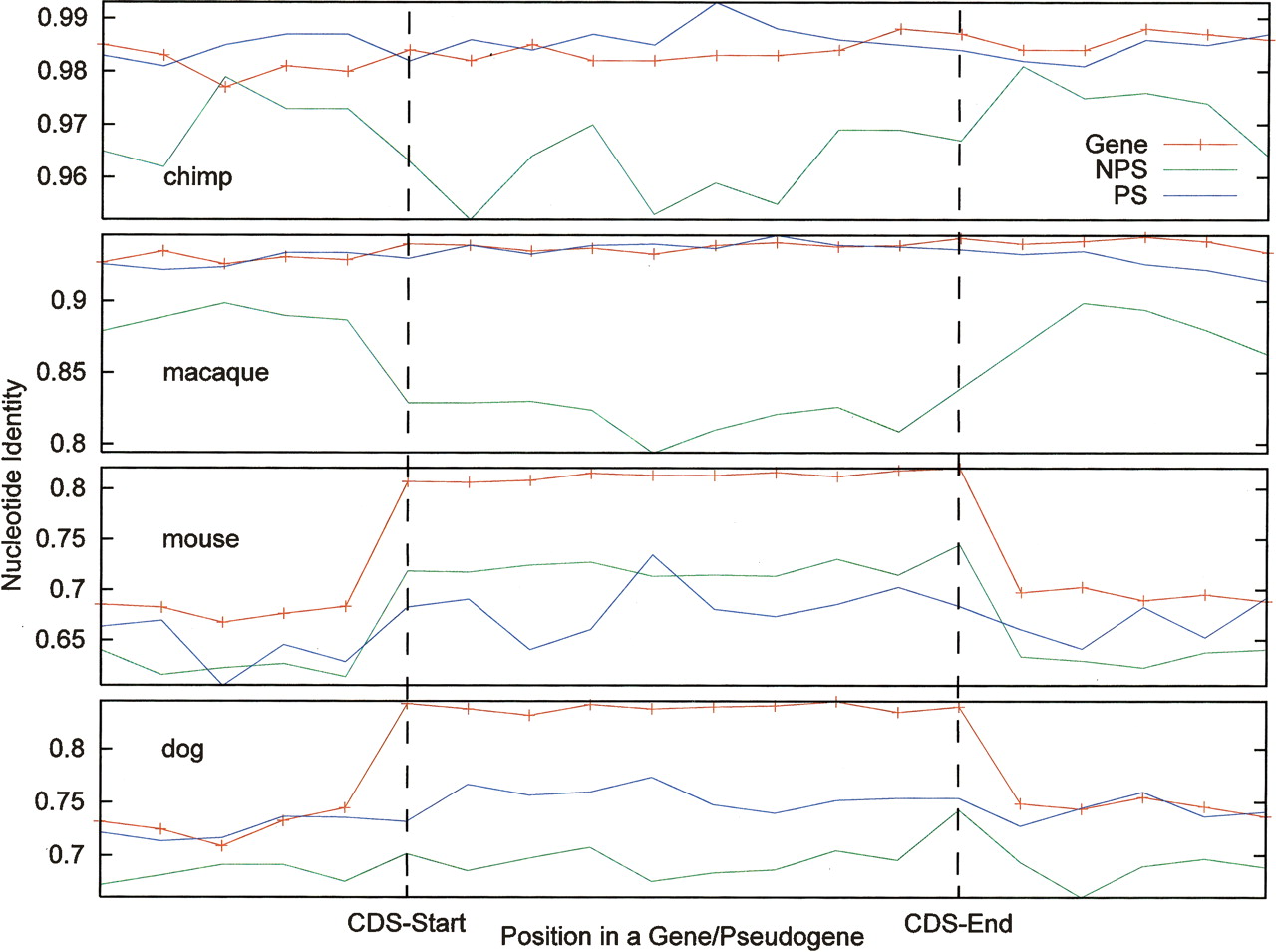Comparison of sequence conservation for genes and pseudogenes in the context of adjacent genomic sequences. The orthologous sequences in chimp, macaque, mouse, and dog were retrieved from the MSA data for protein “coding” regions (CDS) of genes and pseudogenes. Their regions were divided into 10 blocks, and pairwise nucleotide sequence identities were calculated for each block. The data shown here are the means for all genes or processed (PS) or nonprocessed (NPS) pseudogenes. For comparison, 500-bp upstream and downstream sequences of CDSs were also analyzed. The P-values of the t-test for the differences between genes and pseudogenes (for all four species) and between NPS and PS (in chimp and macaque) are <0.01.