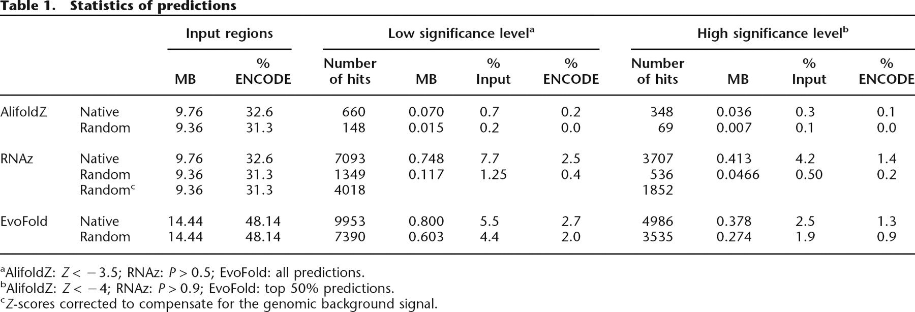 bAlifoldZ: Z < −4; RNAz: P > 0.9; EvoFold: top 50% predictions.
