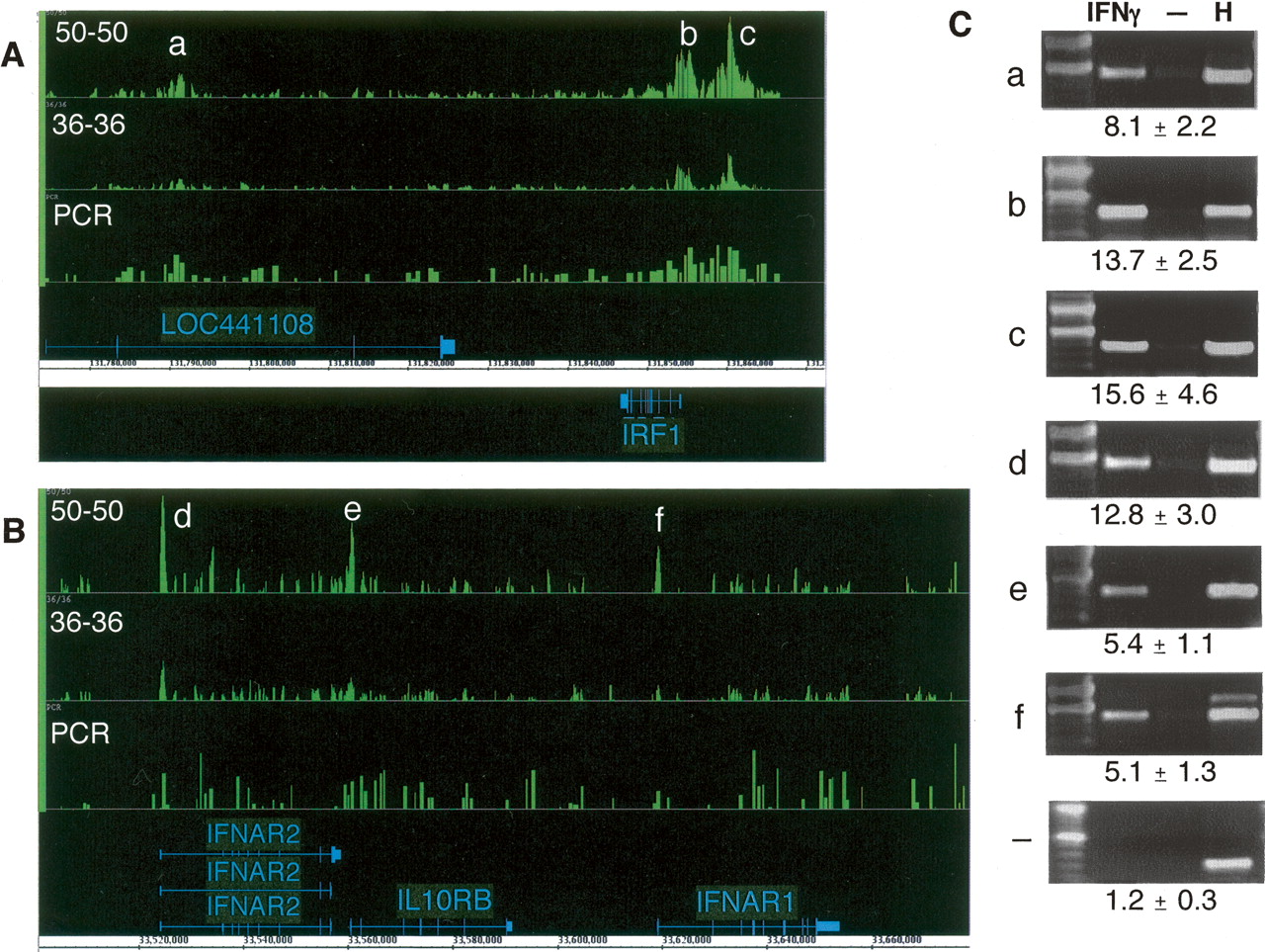 Comparison of signal tracks. Signal enrichment tracks are plotted for the 50-b, 36-b, and PCR product array platforms for two different loci. Signals of STAT1 bound regions in IFNG-stimulated cells relative to untreated cells were derived from multiple biological replicates with one replicate hybridized per array (Methods; Supplemental Table 1). Annotations above the coordinate axis are for genes on the forward strand, and those below are for reverse-strand genes. Signal enrichment tracks are plotted to the same scale for the platforms displayed, from 0 to 2.5 in panel A and from 0 to 1.3 in panel B. (A) The IRF1 locus and flanking regions on Chromosome 5 (coordinates 131,770,000 to 131,870,000 from build NCBIv35 [hg17]). (B) The loci on Chromosome 21, which contain the cytokine receptors, IFNAR2, IL10RB, and IFNAR1 (coordinates 33,500,000 to 33,680,000). (C) Targets that have been validated by ChIP-PCR (shown) are indicated by symbols a through f. The lanes are labeled for ChIP DNA from IFNG-stimulated (IFNγ) cells, ChIP DNA from unstimulated cells, and for HeLa S3 genomic DNA. Fold enrichments, as calculated for several biological replicates (see Methods), are indicated for each target (a–f) and for a negative control region (−).