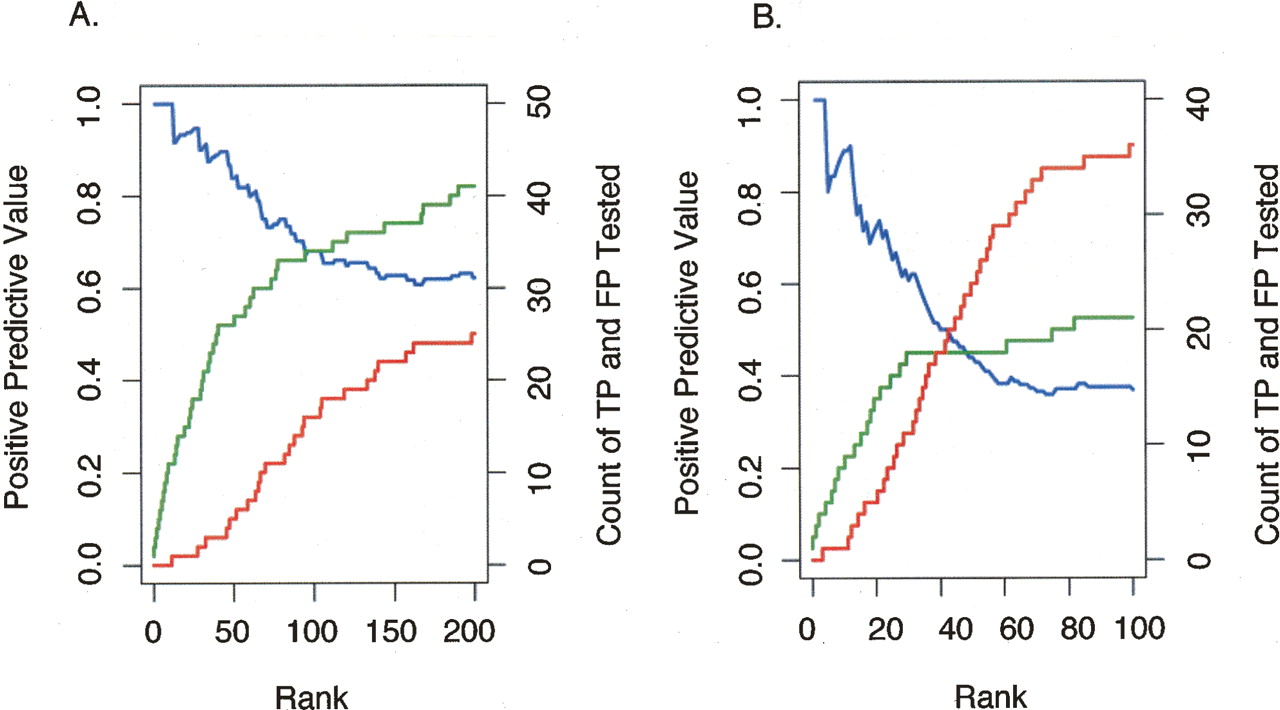Validation frequency as a function of rank order for the 50 b every 50-b array and PCR product array platforms. For each ChIP-chip data set (derived from multiple biological replicates with one replicate hybridized per array) (Supplemental Table 1), we identified the target regions above a threshold. The targets were tested and divided into true positives (TP) and false positives (FP) based on a ChIP-PCR validation assay (as described in Methods). Sensitivity [defined as TP/(TP + FN), where FN are the number of false negatives] and specificity [defined as TN/(TN + FP), where TN are the number of true negatives] of the target list at this threshold are difficult to accurately estimate since the total number of actual binding sites (TP + FN) as well as the number of true negatives (TN) are not known, and other methods for direct, in vivo identification binding independent of ChIP methods do not exist. Nonetheless, the positive predictive value [defined as TP/(TP + FP)] for ChIP-chip experiments can be estimated using data from ChIP-PCR validations. (A) The number of targets confirmed by validation, true positives (green line), as well as the number targets that did not validate, false positives (red line), is plotted as a function of target rank (ordered by signal enrichment) for the 50 b every 50-b array platform (from three biological replicate arrays). The positive predictive value (blue line) is also shown as a function of rank. (B) The number of true positives (green line), the number of false positives (red line), and the positive predictive value (blue line) are shown as a function of rank for the PCR product array platform (data from six biological replicate arrays).