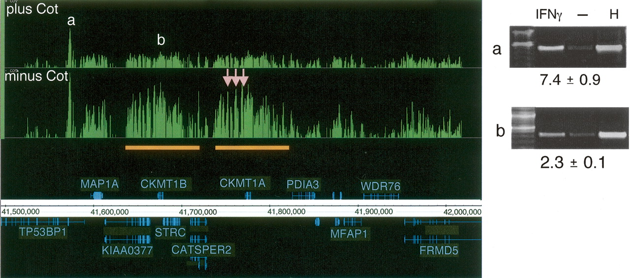 The effect of Cot-1 DNA in determining STAT1 targets. Signal enrichment tracks are shown for data sets of paired samples (see Methods; Supplemental Table 1) that were hybridized either in the presence of Cot-1 DNA (top track) and or in the absence of Cot-1 DNA (lower track), both on the 50 b every 38-b array platform. Annotations above the coordinate axis are for genes on the forward strand, and annotations below the coordinate axis are for genes on the reverse strand. Signal enrichment tracks are plotted to the same scale from 0 to 3.3 for the Cot-present and Cot-absent data sets. Targets with labels “a” and “b” are identified by both experiments (ChIP-PCR gel images are shown). Three targets (pink arrows) appeared only in the Cot-absent experiment and were identified as false positives by ChIP-PCR validation (gel images not shown). The orange bars indicate a region of segmental duplication, which is a potential cause of the false positives (due to cross-hybridization with confirmed target “b”). For the ChIP-PCR validations displayed, the lanes are labeled for ChIP DNA from IFNG-stimulated cells, ChIP DNA from unstimulated cells, and for HeLa S3 genomic DNA. The fold enrichments are indicated and were calculated for several biological replicates (see Methods).