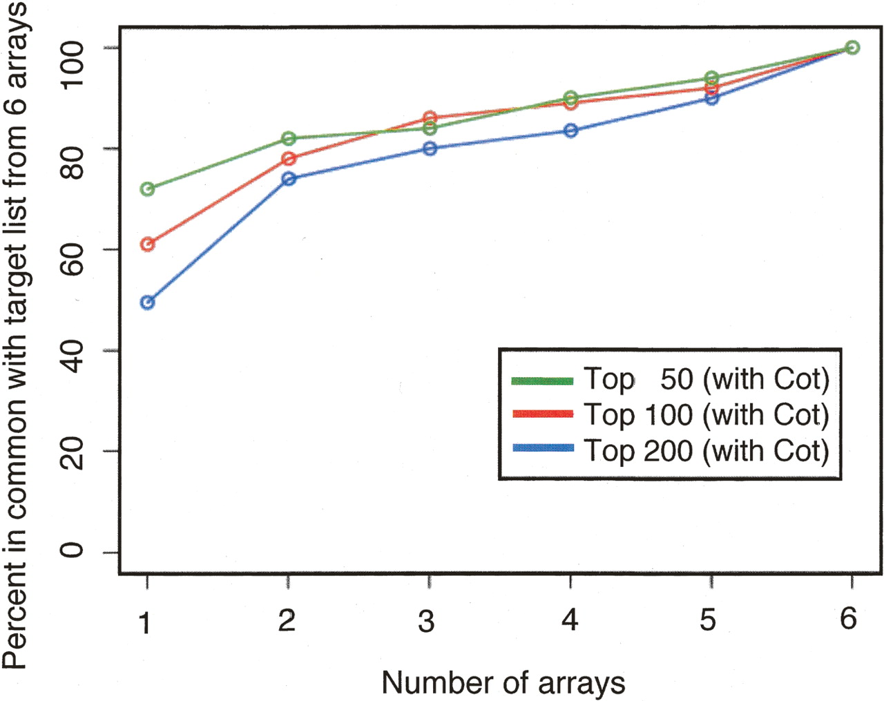 The value of adding biological replicates to a ChIP-chip data set. For the six 50 b every 38-b arrays that were hybridized in the presence of Cot DNA, the reproducibility of target lists for the top 50 (green), 100 (red), and 200 (blue) binding regions was examined as a function of the number of biological replicates analyzed. Each biological replicate is hybridized to a separate array. The agreement is compared against the target list identified by using all six arrays. We see that greater than 80% agreement is obtained when three or more biological replicates are used.