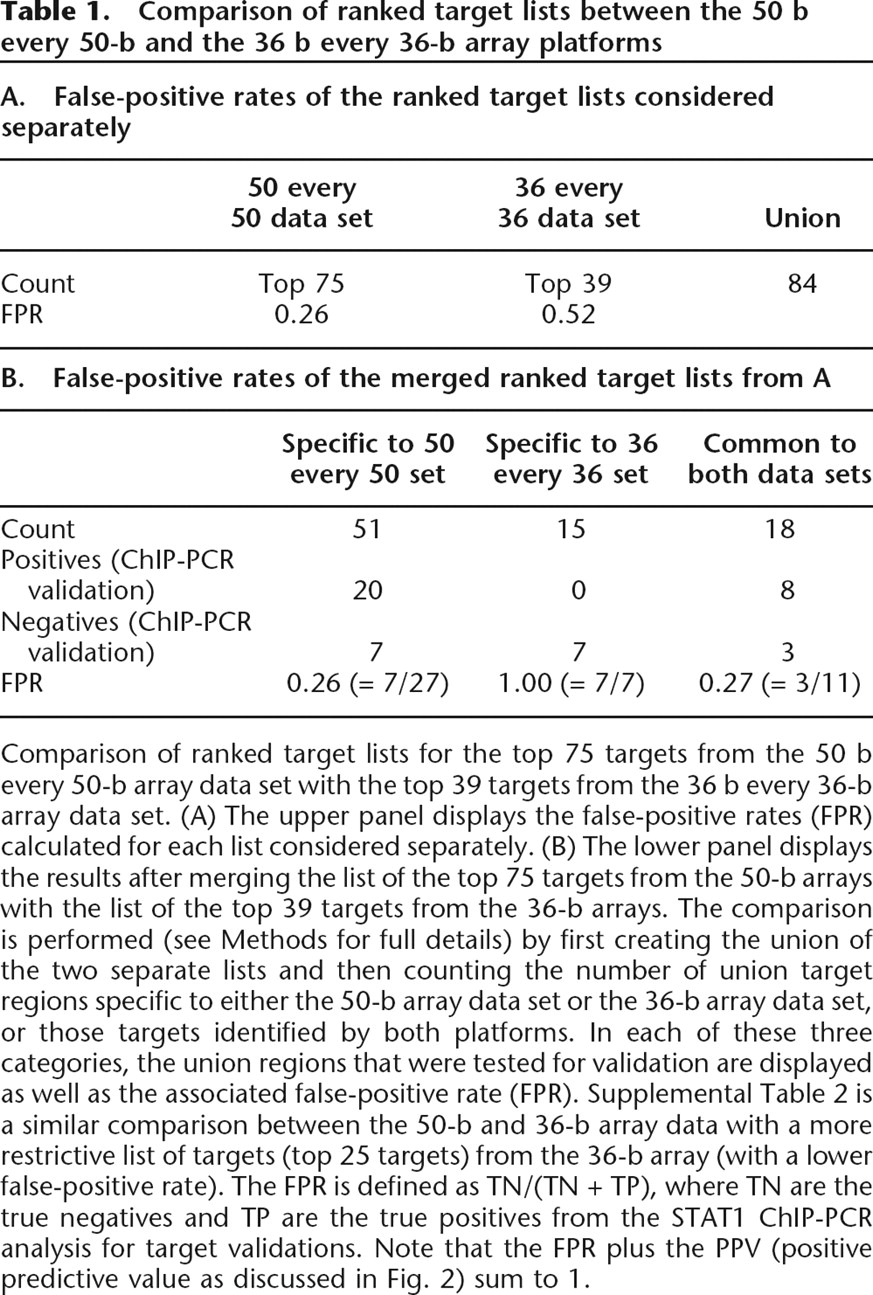 Comparison of ranked target lists for the top 75 targets from the 50 b every 50-b array data set with the top 39 targets from the 36 b every 36-b array data set. (A) The upper panel displays the false-positive rates (FPR) calculated for each list considered separately. (B) The lower panel displays the results after merging the list of the top 75 targets from the 50-b arrays with the list of the top 39 targets from the 36-b arrays. The comparison is performed (see Methods for full details) by first creating the union of the two separate lists and then counting the number of union target regions specific to either the 50-b array data set or the 36-b array data set, or those targets identified by both platforms. In each of these three categories, the union regions that were tested for validation are displayed as well as the associated false-positive rate (FPR). Supplemental Table 2 is a similar comparison between the 50-b and 36-b array data with a more restrictive list of targets (top 25 targets) from the 36-b array (with a lower false-positive rate). The FPR is defined as TN/(TN + TP), where TN are the true negatives and TP are the true positives from the STAT1 ChIP-PCR analysis for target validations. Note that the FPR plus the PPV (positive predictive value as discussed in Fig. 2) sum to 1.