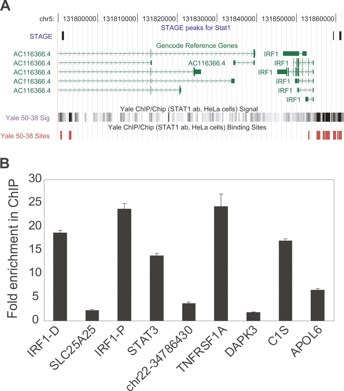 (A) STAT1 binding sites in the ENCODE regions. A portion of the ENCODE region ENm002 is shown as displayed in the UCSC Human Genome Browser. Three out of the seven STAT1 binding sites identified by STAGE matched STAT1 binding sites identified by ChIP-chip analysis performed on NimbleGen ENCODE region tiling arrays. Transcripts identified in this region by the GENCODE project are shown in green. The bottom shows raw ratio data as well as peak calls for STAT1 binding sites from NimbleGen ChIP-chip data. (B) Quantitative ChIP analysis of binding sites identified by STAGE. Nine out of 10 binding sites detected by STAGE were validated as true binding loci by quantitative PCR. Columns show fold enrichment of each locus in the ChIP sample relative to input DNA, normalized to an unrelated control locus. STAGE detected two binding sites separated by >1500 bp in the IRF1 promoter which are indicated in the figure. IRF-D indicates the distal (IRF1-distal) and IRF1-P indicates the proximal site (IRF1-proximal). No genes were found in the proximity of the site indicated as chr22-34786430.
